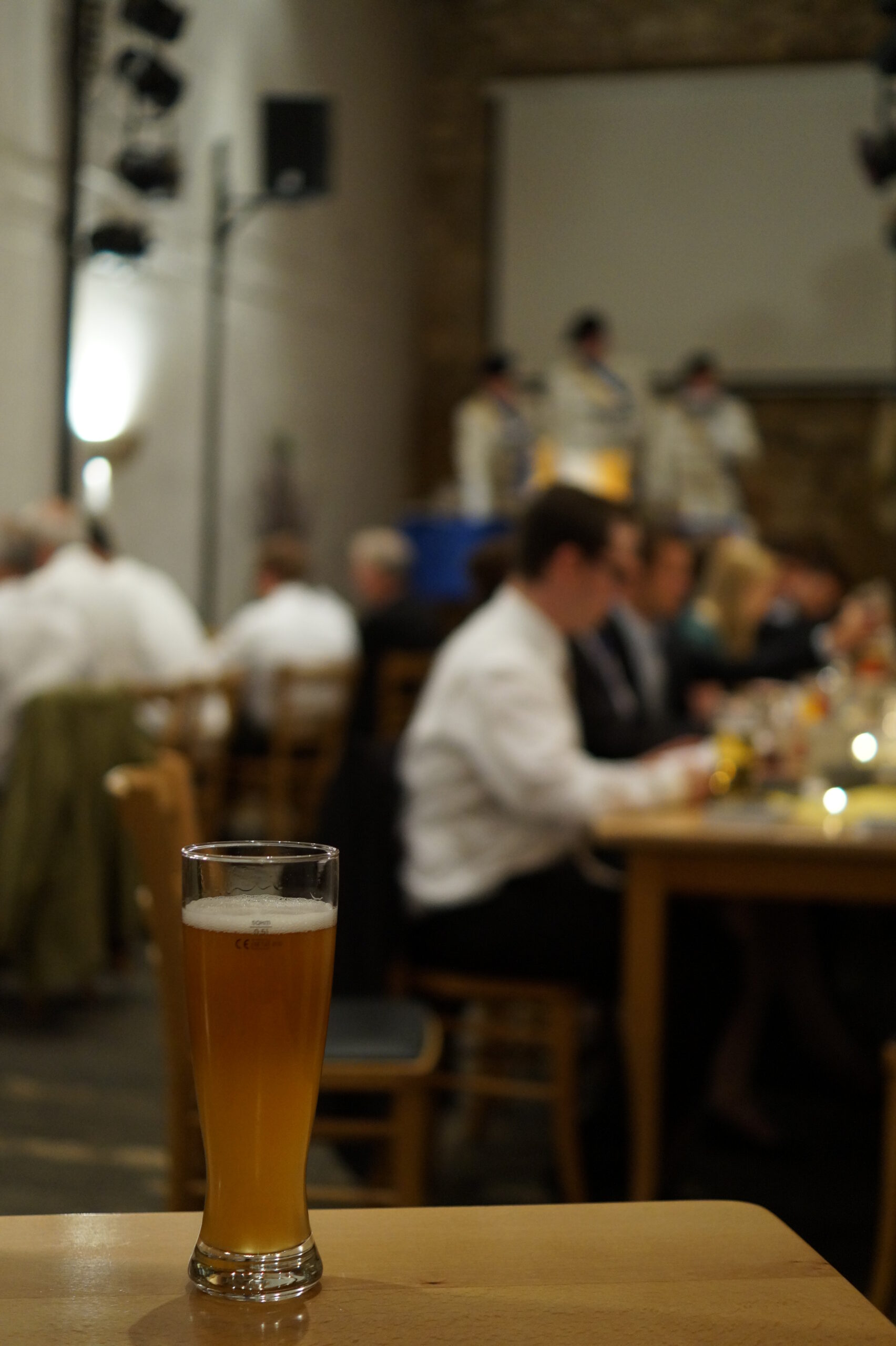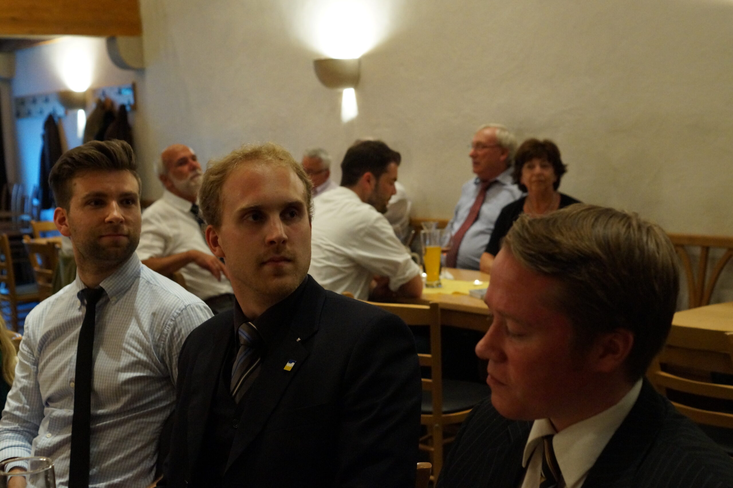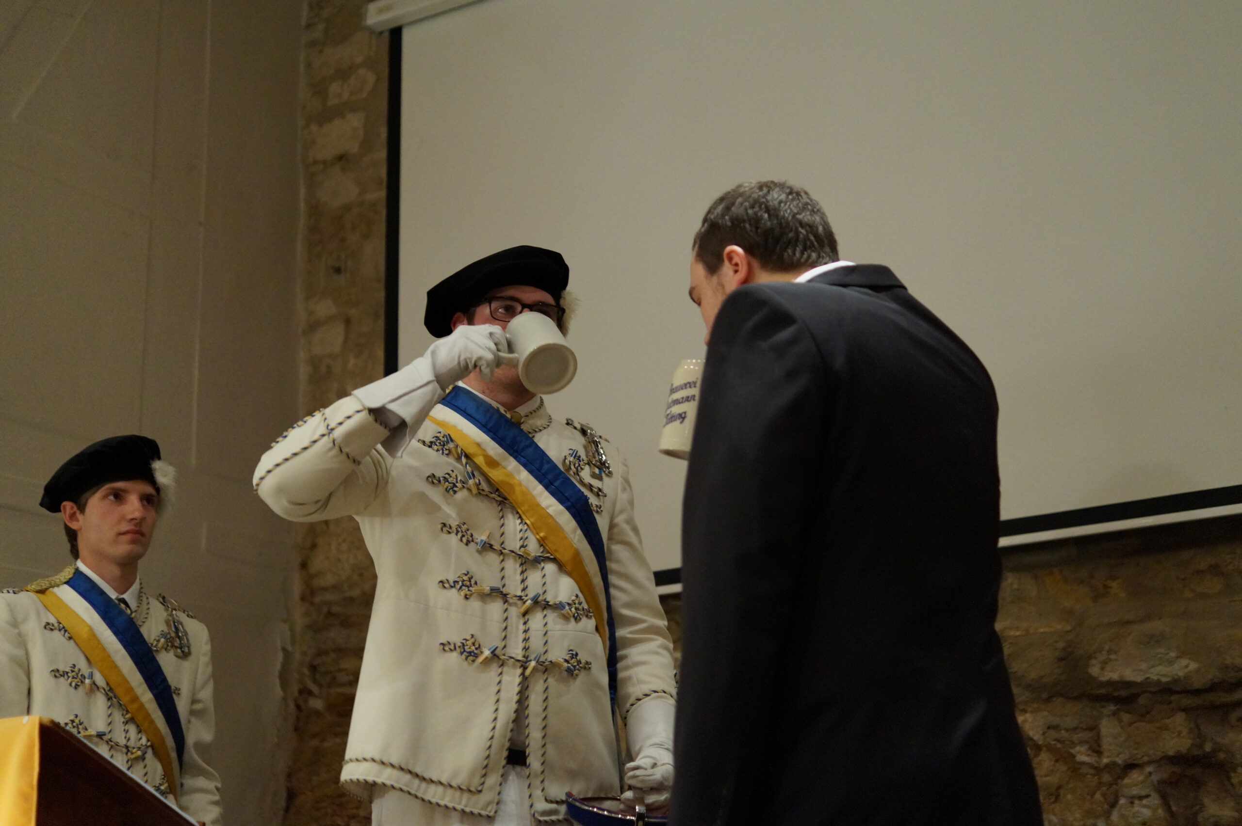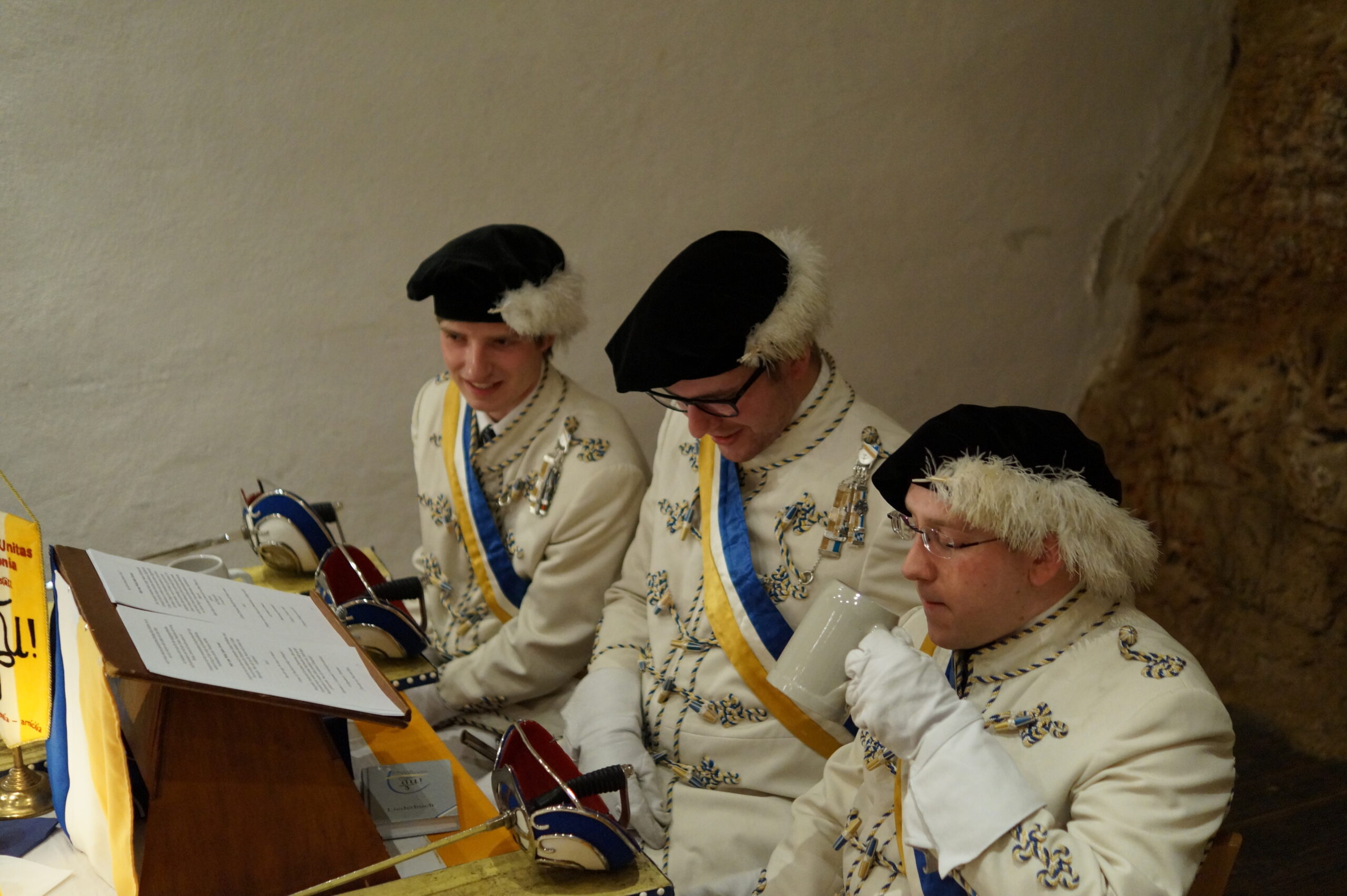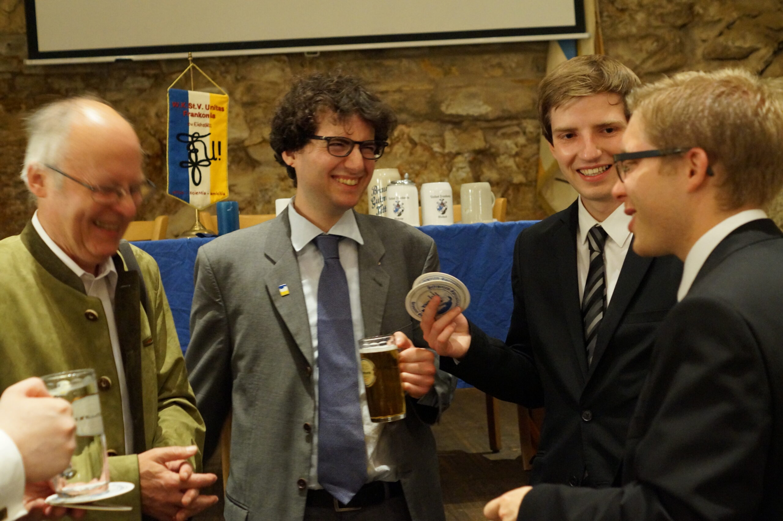 In der anschließenden Diskussion konnten noch Sorgen und Fragen bezüglich der brisanten, beinahe zeitlosen Problematik vom Plenum vorgetragen werden, bevor die hochoffizielle Festkneipe unter der Leitung des hohen Seniors und seiner Conchargen eröffnet wurde. In der Prinzipienrede monierte Bbr. Matthias J.R. Stüeken die Gefahr der Abflachung unitarischen Engagements und rief das Lebensbundprinzip in Erinnerung. Beispielhaft für die Entscheidung das ganze Leben ein treuer und dienender Unitarier zu sein wie zu werden, ist die Burschung unseres Quästors Bbr. Michael Holaschke, der ab jetzt den Weg als Vollmitglied der Aktivitas geht. Jene wiederum erhielt auch Verstärkung: Bbr. Christoph Schiebel und Bbr. Marcel Sahlmen wurden im Anschluss an die Burschung in den Fuxenstall aufgenommen. Somit hat die Frankonia die 20er-Marke erreicht, was die Anzahl an Aktiven angeht!