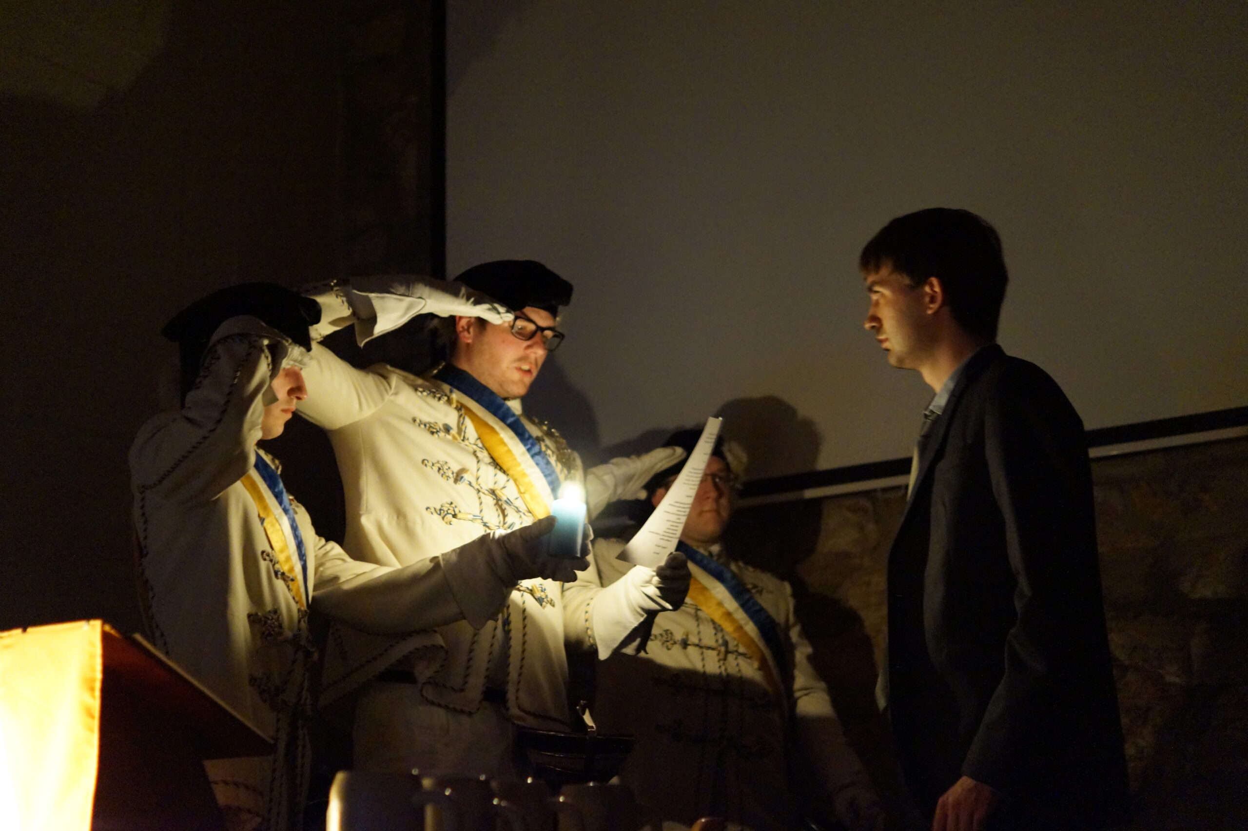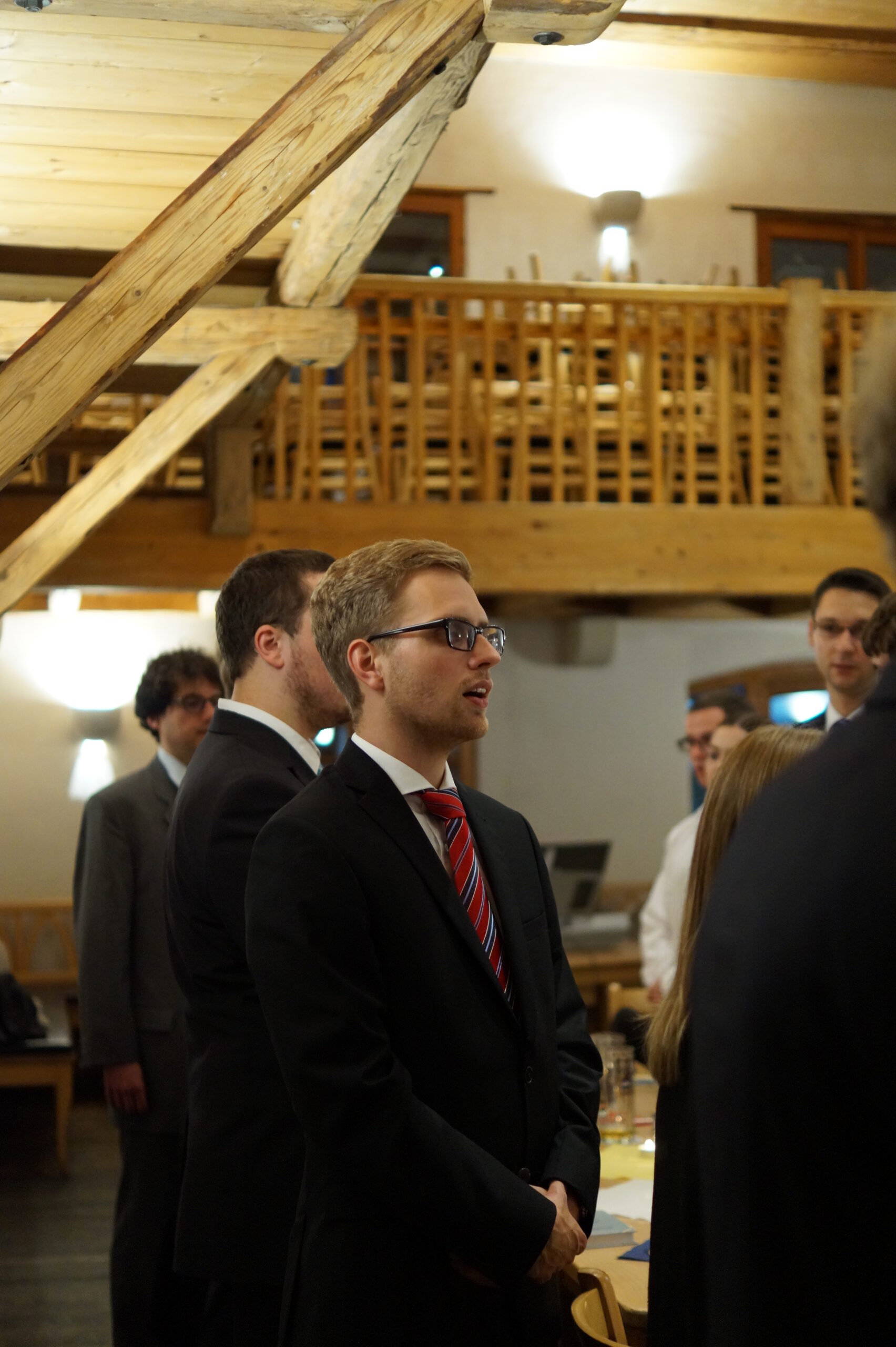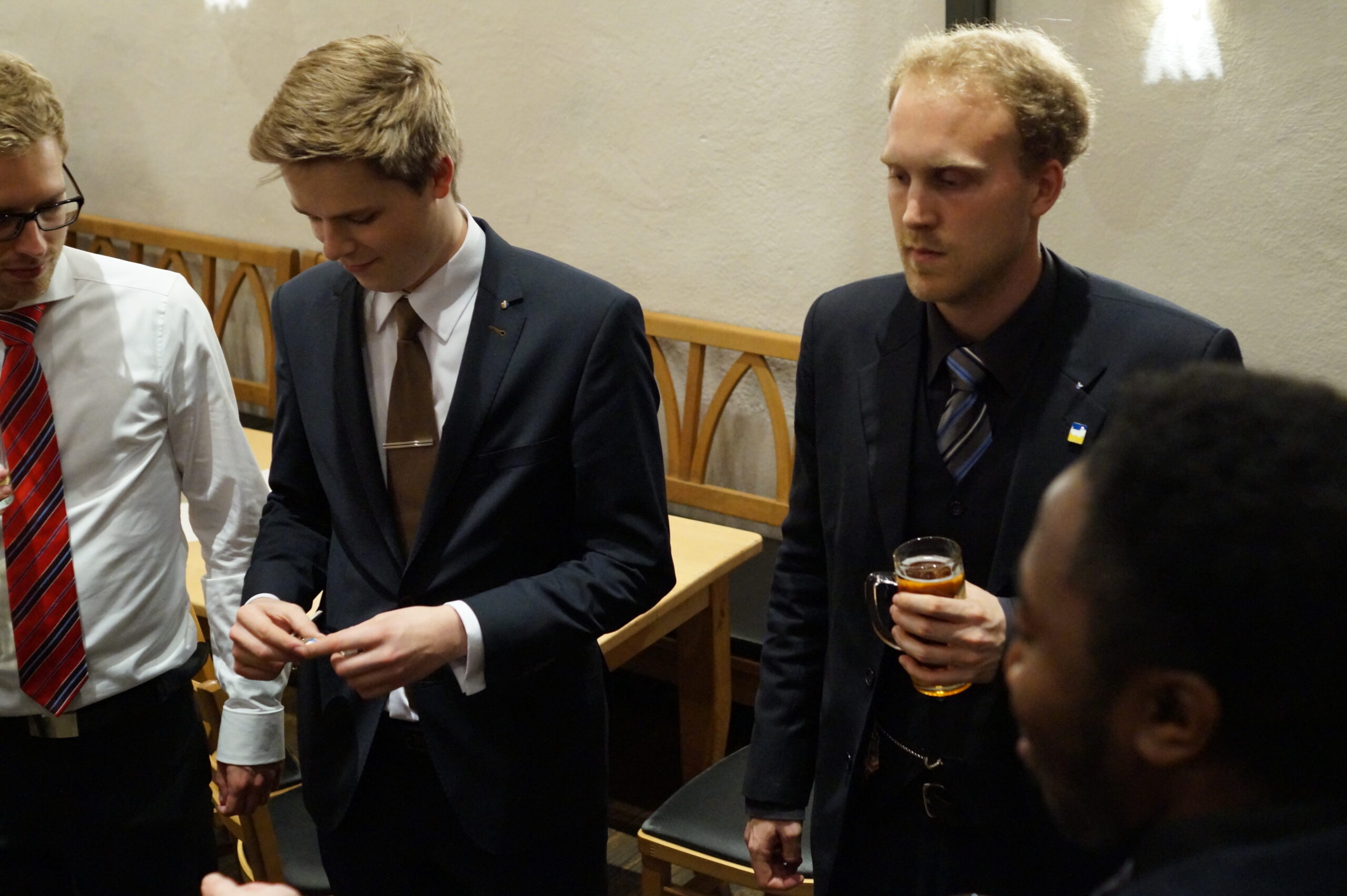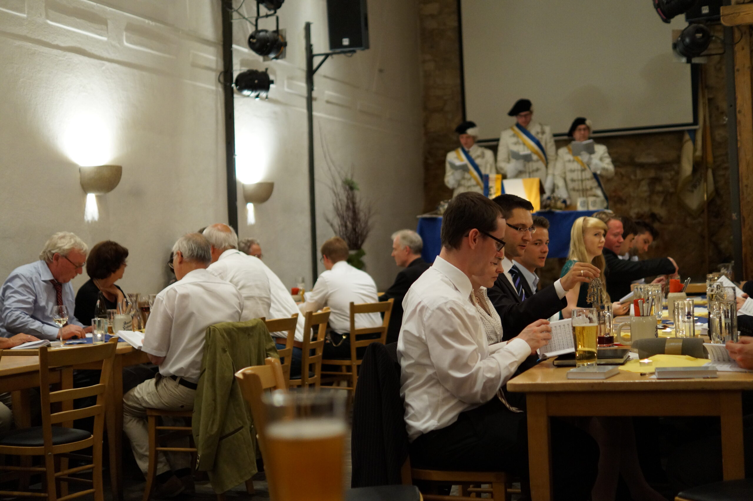 In der anschließenden Diskussion konnten noch Sorgen und Fragen bezüglich der brisanten, beinahe zeitlosen Problematik vom Plenum vorgetragen werden, bevor die hochoffizielle Festkneipe unter der Leitung des hohen Seniors und seiner Conchargen eröffnet wurde. In der Prinzipienrede monierte Bbr. Matthias J.R. Stüeken die Gefahr der Abflachung unitarischen Engagements und rief das Lebensbundprinzip in Erinnerung. Beispielhaft für die Entscheidung das ganze Leben ein treuer und dienender Unitarier zu sein wie zu werden, ist die Burschung unseres Quästors Bbr. Michael Holaschke, der ab jetzt den Weg als Vollmitglied der Aktivitas geht. Jene wiederum erhielt auch Verstärkung: Bbr. Christoph Schiebel und Bbr. Marcel Sahlmen wurden im Anschluss an die Burschung in den Fuxenstall aufgenommen. Somit hat die Frankonia die 20er-Marke erreicht, was die Anzahl an Aktiven angeht!