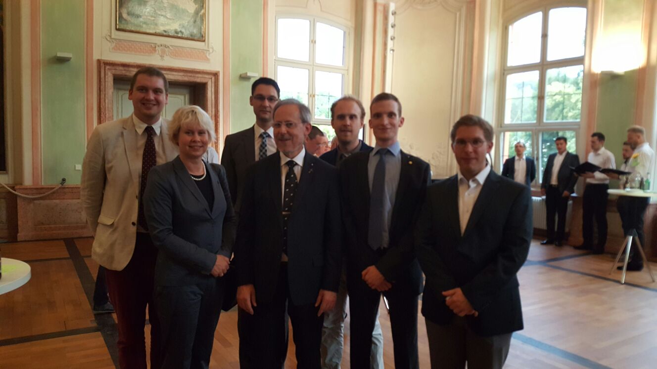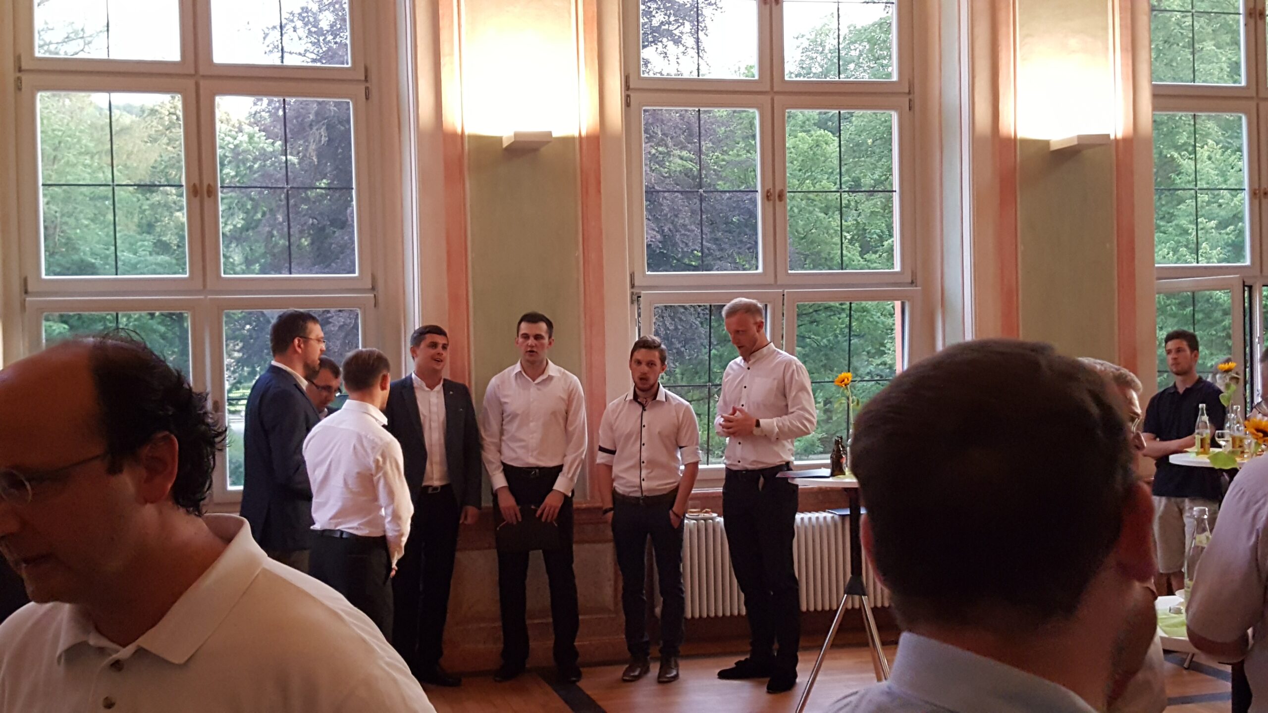 Im Anschluss an die Abschiedsvorlesung lud Bundesbruder Johannes Hofmann zum Empfang in den barocken Holzersaal der ehemaligen der bischöflichen Sommerresidenz in Eichstätt ein, wo wir Unitarier mit ihm im Sinne der Amicitia anstießen und ihm einen angenehmen Ruhestand wünschten. Johannes Hofmann wird nach seiner Emeritierung weiterhin als Pfarrer in Theißing Seelsorge leisten und versprach uns, weiterhin gerne und oft zu seiner Unitas zu kommen.