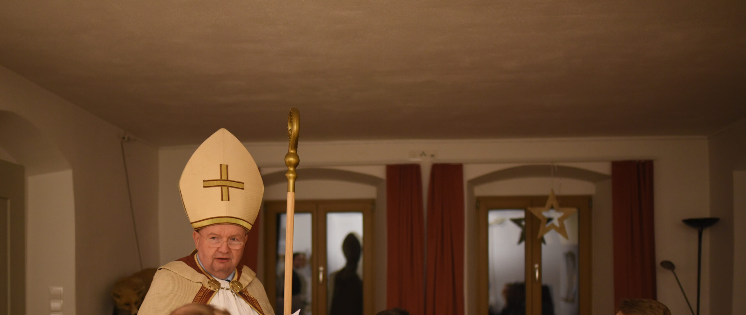 Plötzlich klopfte es an der Tür. Es wurde geöffnet. Und wer stand im Raum? Der Heilige Bischof Nikolaus! Ganz klassisch und traditionell mit Bischofsstab und Mitra, nicht im Weihnachtsmann-Outfit.