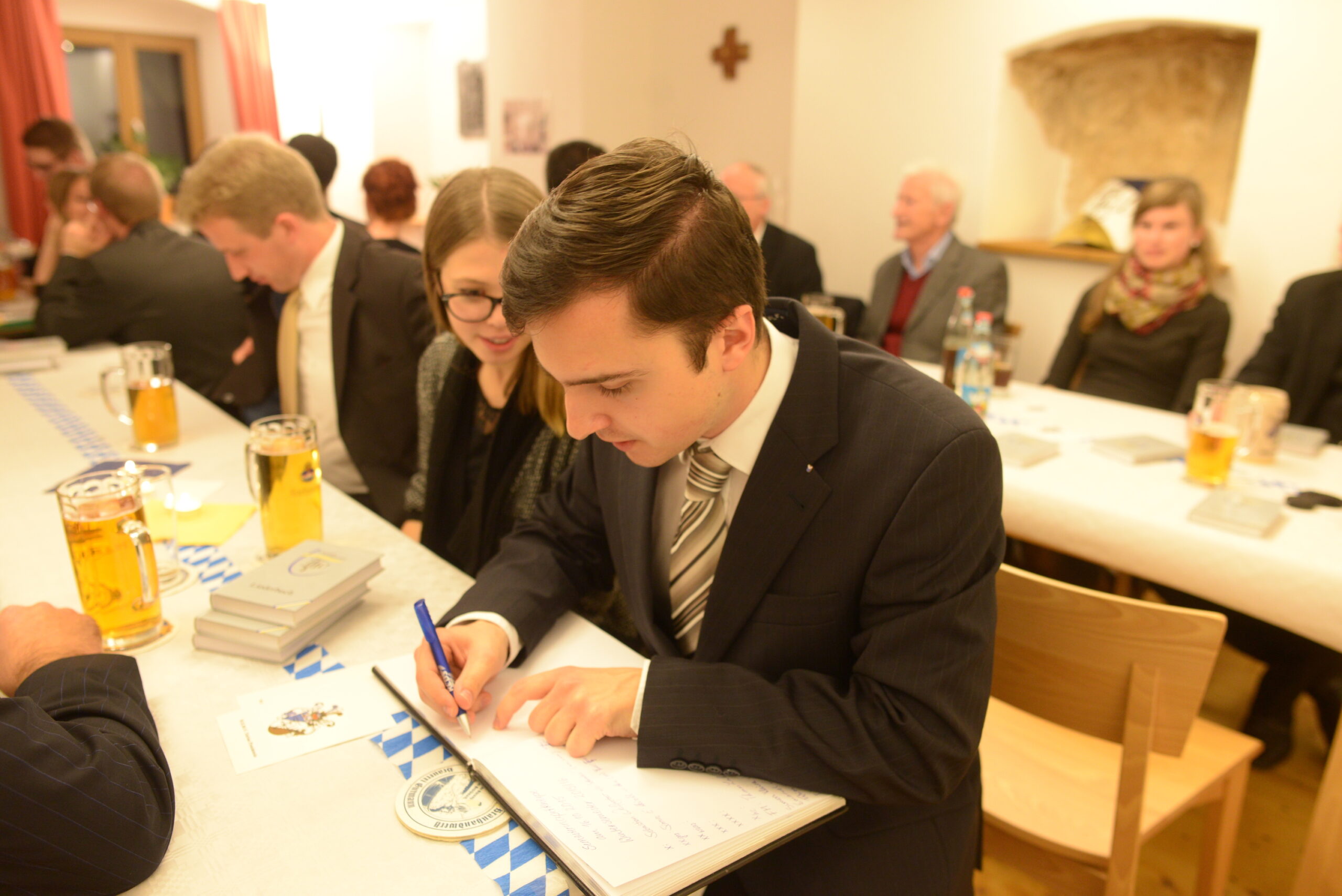 IMG_2982Mit brausenden Klängen durch den Tastenvirtuosen und Bierorgler Bbr. AH Domvikar Dr. Thomas Stübinger v/o Don Eleganza fuhr der offizielle Teil der Kneipe mit einer Philistrierung unseres lb. Bbr. Emanuel Leonhard v/o Kanne fort. Über den zuteil gewordenen Burschentod freute sich der Neophilister derart, dass er schnurstracks bei den übrigen Aktiven seinem Vulgo alle Ehre tat.