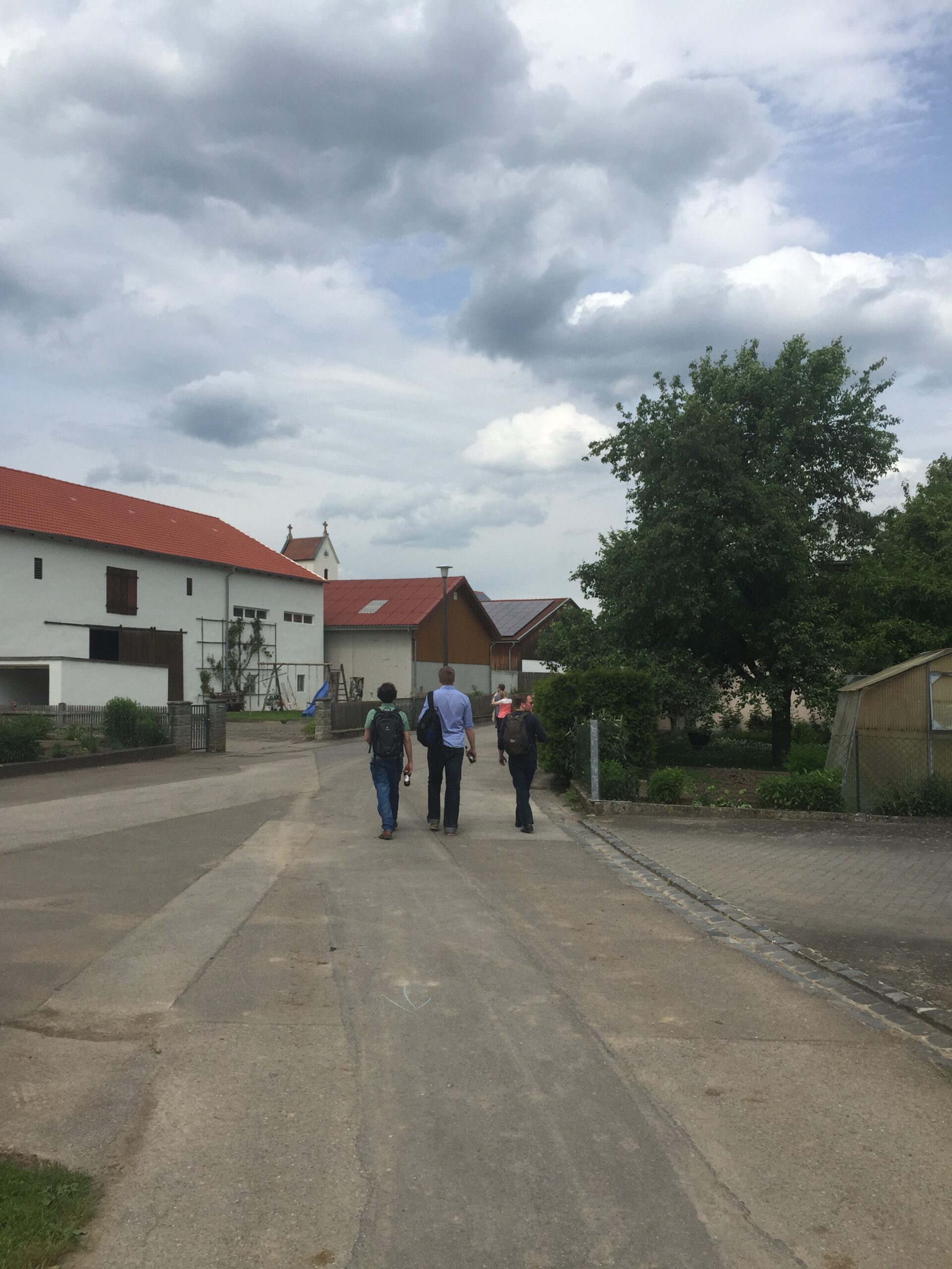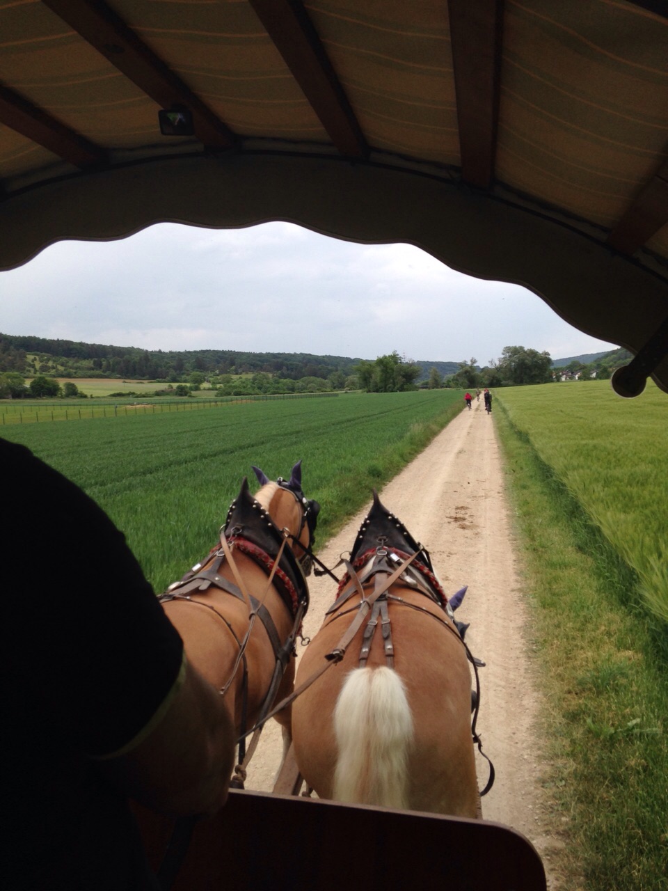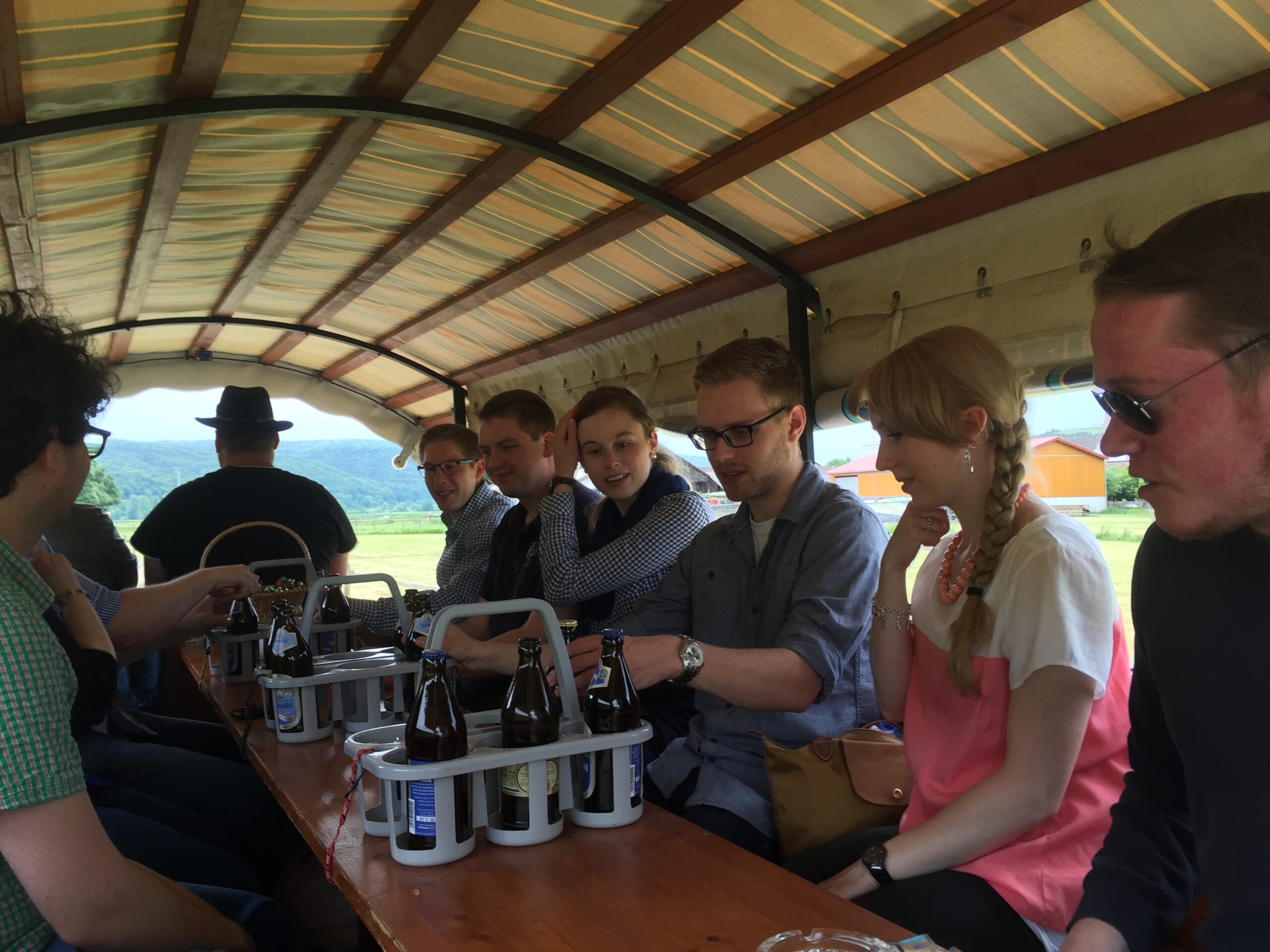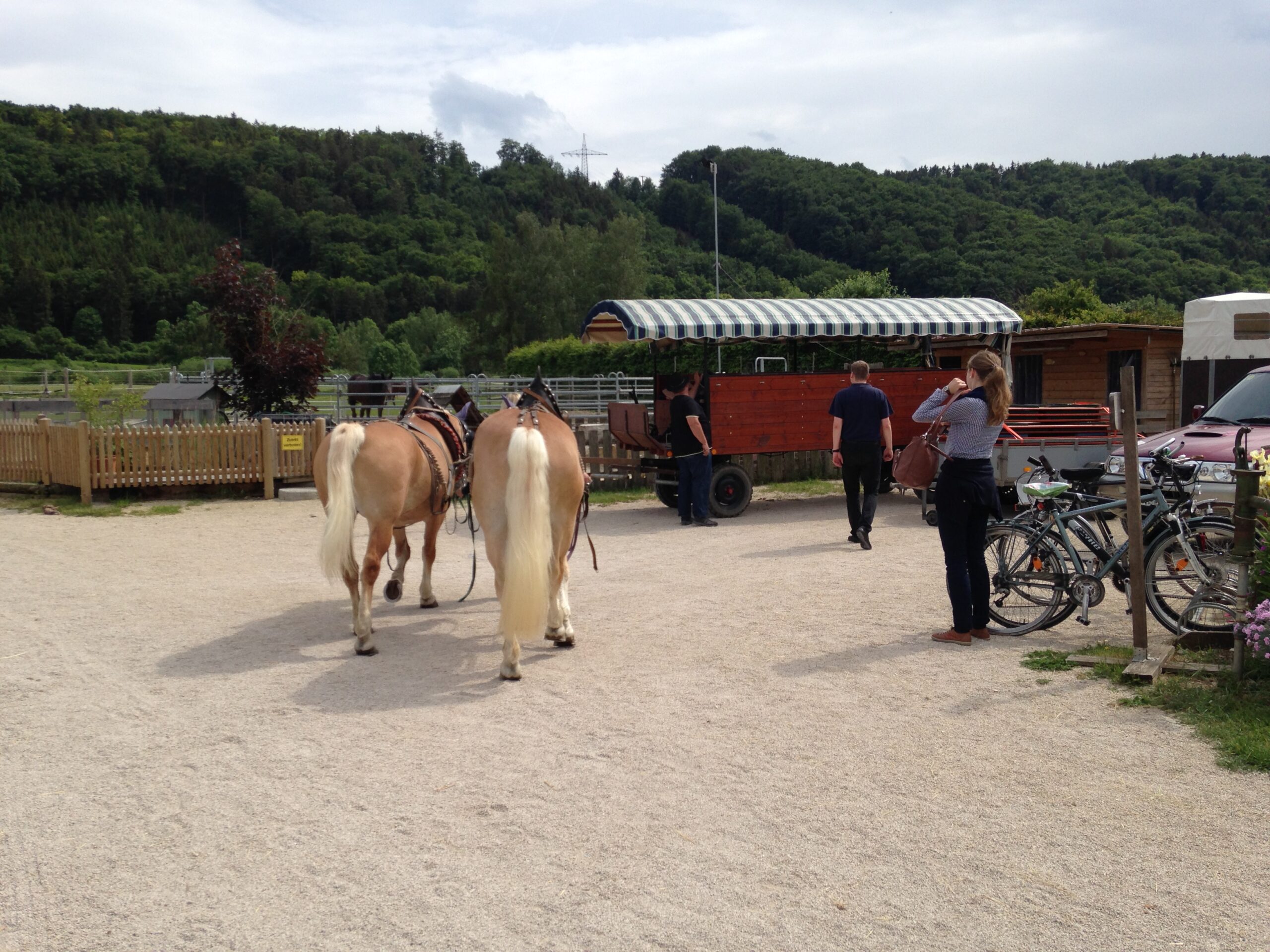 Während einige von uns den Weg zum Treffpunkt in Landershofen radelten, machten andere bei anfangs sonnigen Wetter und genügend kühlen Weggetränken eine einstündige Wanderung. Am Bauernhof angekommen, durfte noch die große Menge an Tieren begutachtet und gestreichelt werden (ja da kommen bei manchem Kindheitsgefühle hoch!). Gleichzeitig machte der Besitzer das Fuhrwerk startklar.