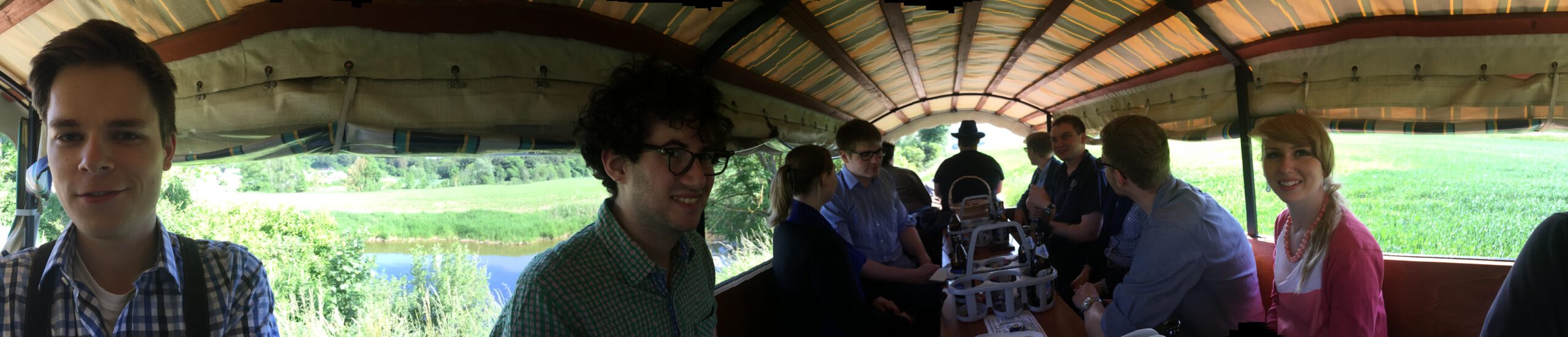 Auf der Fahrt genoss die Mannschaft den kühlen Regen, die guten Gespräche und generell die Natur , bevor nach dem Schauer das altbewährte studentische Liedgut ausgepackt wurde, was unserem Chauffeur imponierte, schließlich hört man das nicht mehr alle Tage. Dazu passt wohl der Ausschnitt eines Gedichts J.W. von Goethes: „Wie sehn‘ ich mich, Natur, nach dir, dich treu und lieb zu fühlen! Ein lust’ger Springbrunn wirst du mir aus tausend Röhren spielen.“ Umso stimmungsvoller wurde das Ganze, als dann doch die Sonne wieder herauskam und uns bis zur Ankunft begleitete.