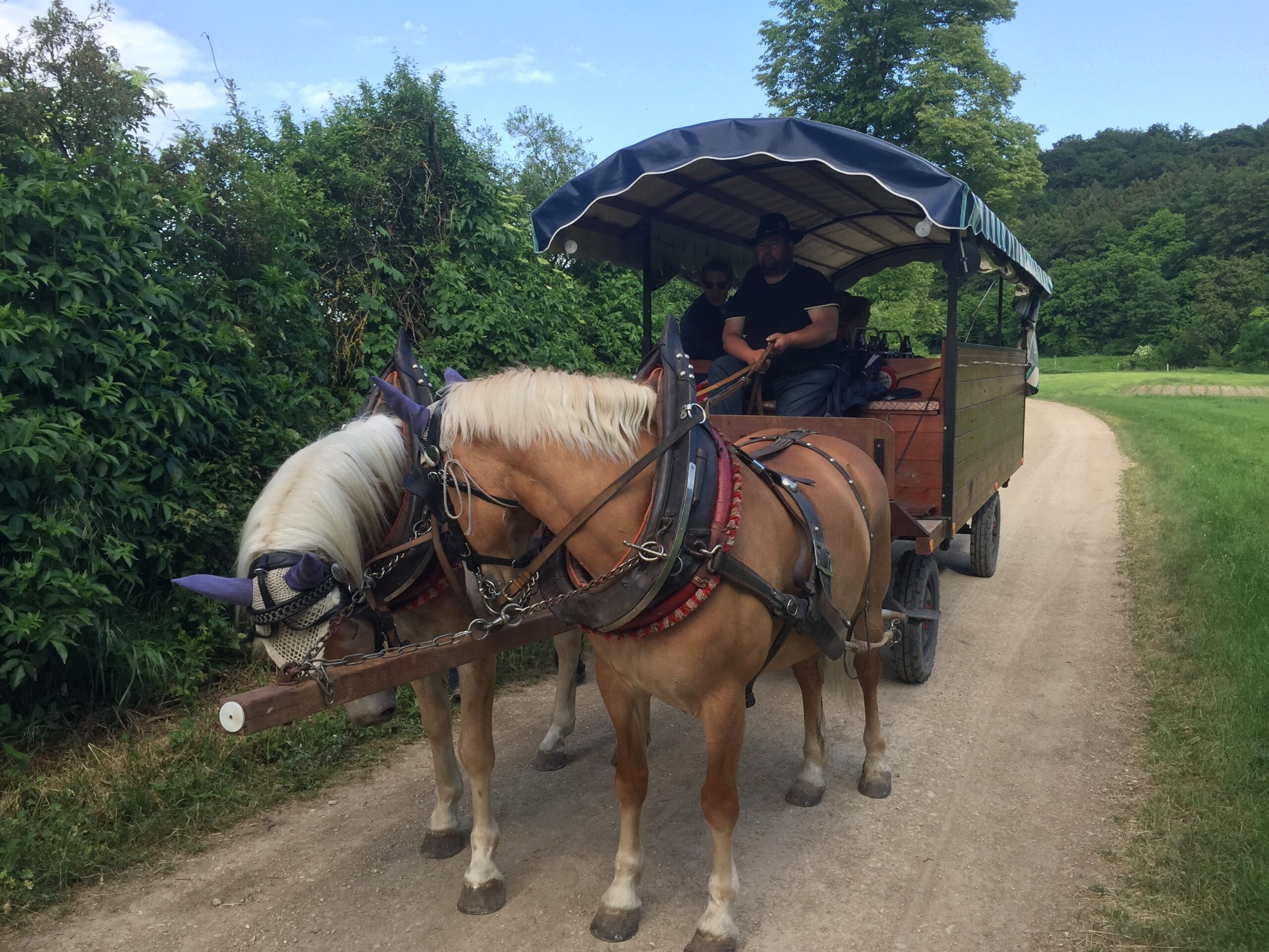 Aktive und ihre lieben Gäste machten sich auf zur gemeinsamen Spazierfahrt auf einem Planwagen, der, gezogen von einem Paar zugkräftigen Haflinger, durch das prächtig grüne und weite Altmühltal hindurchfuhr.