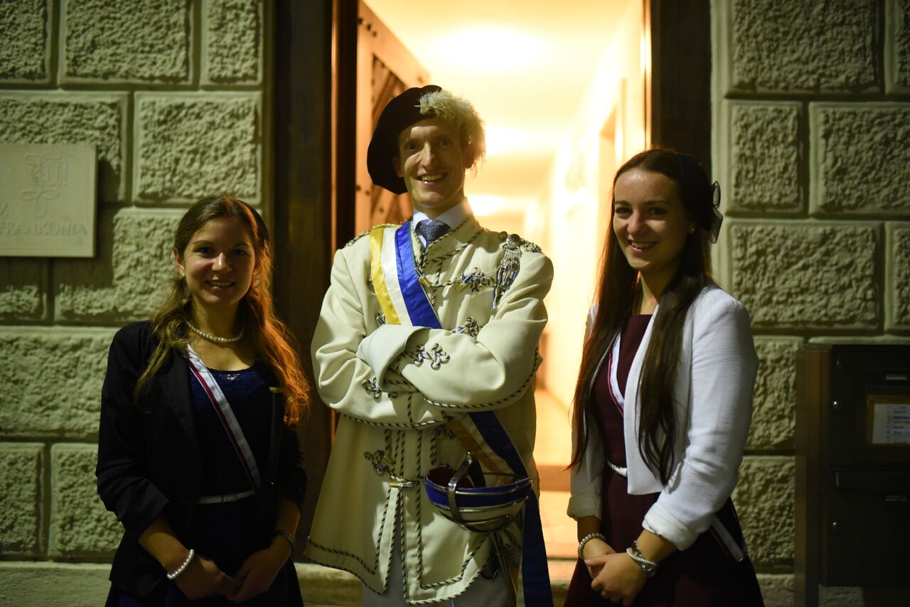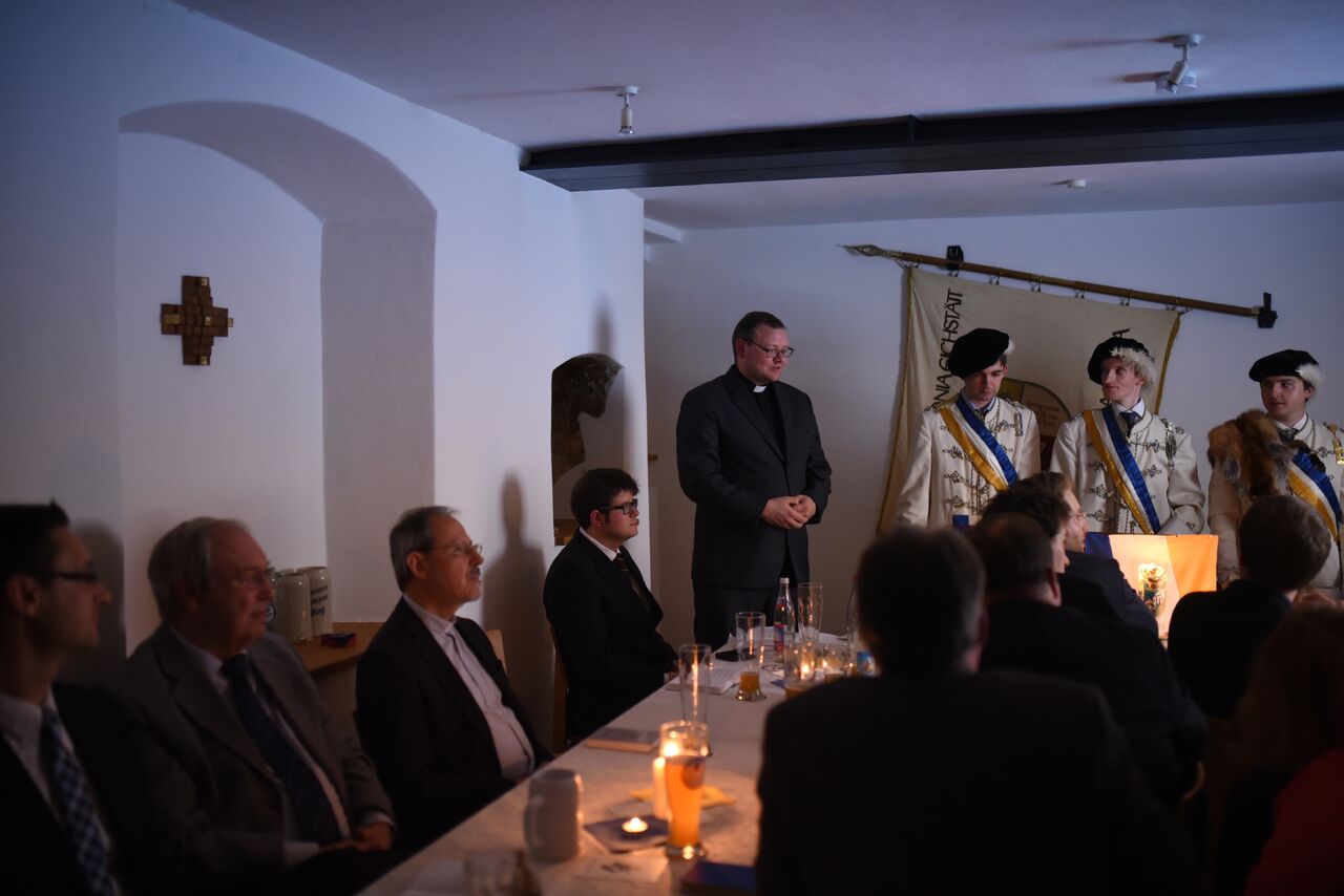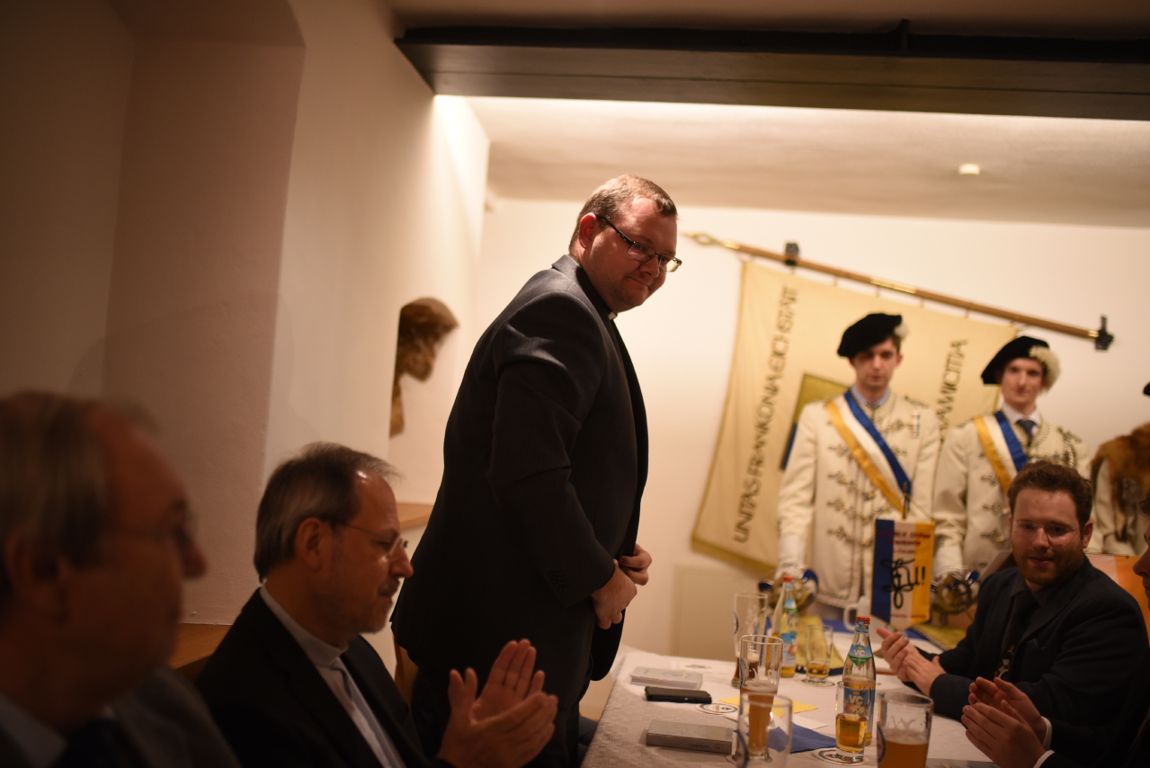 Das Präsidium blickte voller Freude auf eine gut gefüllte Corona und begrüßte die Ehrengäste des feierlichen Abends. Hierzu zählten insbesondere die Vertreterinnen einer sehr verehrlichen C.C.S. EYSTETTENSYA zu Eichstätt, die hohe Prima Anne Marie Kramer sowie die hohe Secunda Sarah J. M. Seitz, die lieben Bundesbrüder der ehrenwerten Altherrenschaft, Domvikar und Geistlicher Beirat der FRANKONIA Pfarrer Dr. Thomas Stübinger und Pfarrer Jochen Scherzer, der Ehrensenior der Aktivitas (X hc) Alexander Gabel, sowie StD i. K. Karl Gritsch. Angereist aus der fernen Ostukraine, trug Bundesbruder Pfarrer Myroslav Rusyn über seine Caritas-Arbeit in seiner Heimat im Angesicht der aktuellen politischen Lage und des bewaffneten Konfliktes nach der Prinzipienrede des hohen Seniors vor.