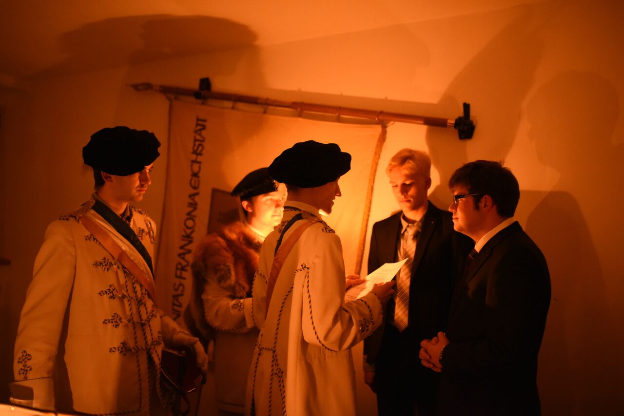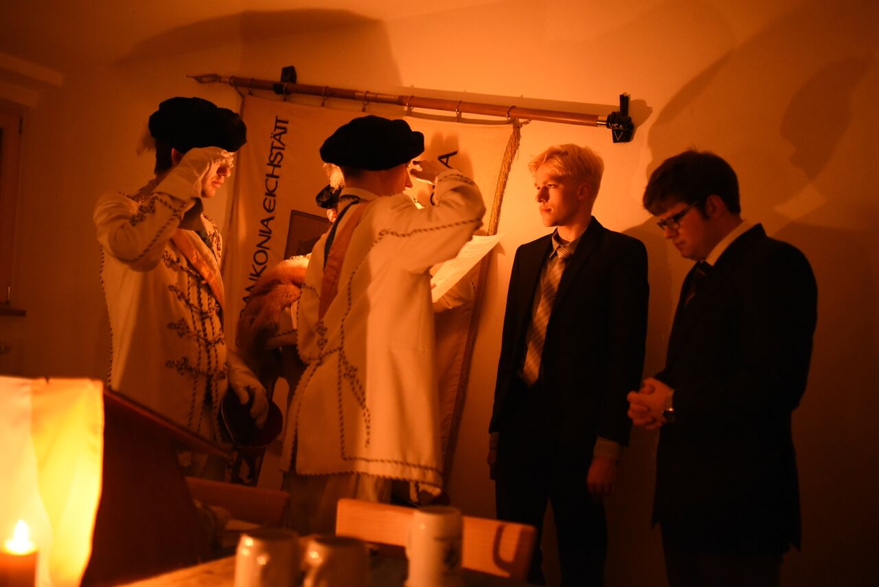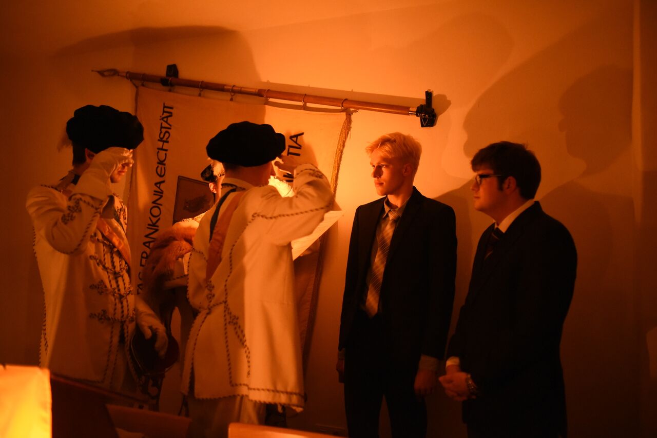 Umrahmt vom unitarischen Bundessang erfuhren die beiden Spefüxe, Florian Rosenhammer und Milo Wild, ihre feierliche Aufnahme als Bundesbrüder und Füxe in die Aktivitas der UNITAS FRANKONIA. Nach vielen rhetorischen Raffinessen und Schmankerln des hohen Seniors erschall-ten nebst den altstudentischen Oden vom „Mozart“ an der Klaviatur „Don Eleganza“ die dritte Strophe des „Liedes der Deutschen“ von Fallersleben und die Bayernhymne. Anschließend gereichte es dem hohen Senior zur höchsten studentischen Ehre, einen urkräftigen, donnerschallenden, unsere UNITAS FRANKONIA niemals untergehen lassenden, alle Farbenbrüder aufblicken lassenden, offiziellen Salamander zu reiben. Im Anschluss an die höchst erfreulichen Grußworte folgten die delikaten Farbenstrophen einer sehr verehrlichen C.C.S. EYSTETTENSIA, einer lieben UNITAS ASSINDIA zu Aachen, UNITAS BERLIN, UNITAS HOHENSTAUFEN zu Stuttgart, UNITAS FRANKONIA und UNITAS FRANKO-PALATIA zu Nürnberg.
