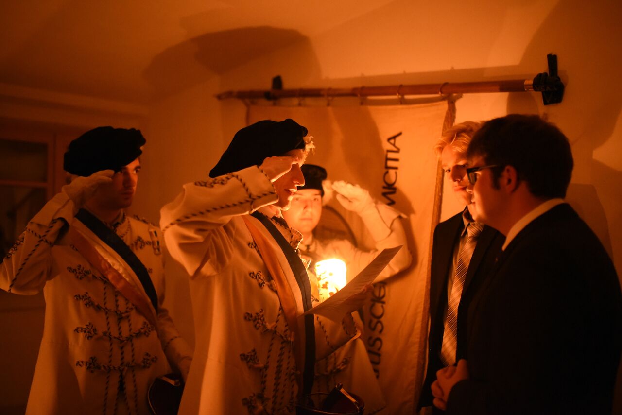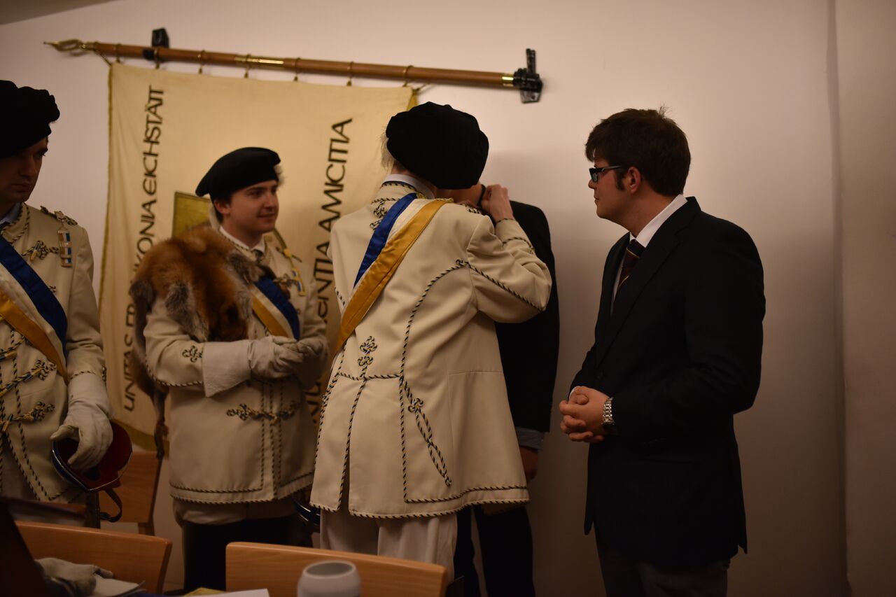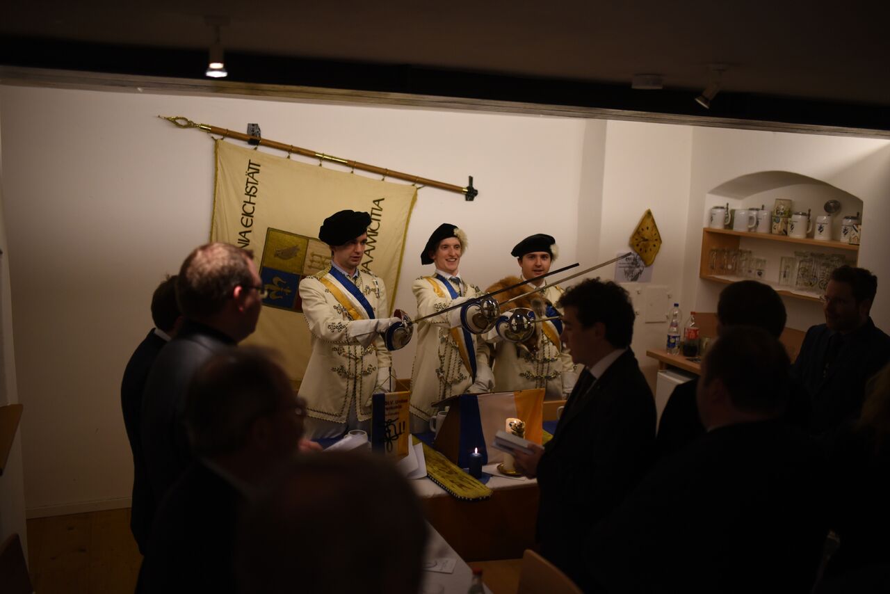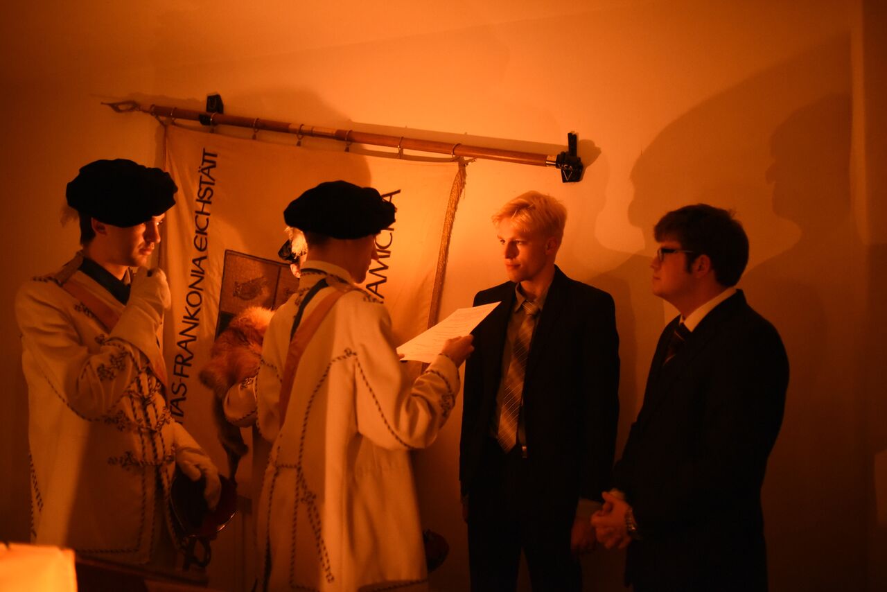 Umrahmt vom unitarischen Bundessang erfuhren die beiden Spefüxe, Florian Rosenhammer und Milo Wild, ihre feierliche Aufnahme als Bundesbrüder und Füxe in die Aktivitas der UNITAS FRANKONIA. Nach vielen rhetorischen Raffinessen und Schmankerln des hohen Seniors erschall-ten nebst den altstudentischen Oden vom „Mozart“ an der Klaviatur „Don Eleganza“ die dritte Strophe des „Liedes der Deutschen“ von Fallersleben und die Bayernhymne. Anschließend gereichte es dem hohen Senior zur höchsten studentischen Ehre, einen urkräftigen, donnerschallenden, unsere UNITAS FRANKONIA niemals untergehen lassenden, alle Farbenbrüder aufblicken lassenden, offiziellen Salamander zu reiben. Im Anschluss an die höchst erfreulichen Grußworte folgten die delikaten Farbenstrophen einer sehr verehrlichen C.C.S. EYSTETTENSIA, einer lieben UNITAS ASSINDIA zu Aachen, UNITAS BERLIN, UNITAS HOHENSTAUFEN zu Stuttgart, UNITAS FRANKONIA und UNITAS FRANKO-PALATIA zu Nürnberg.