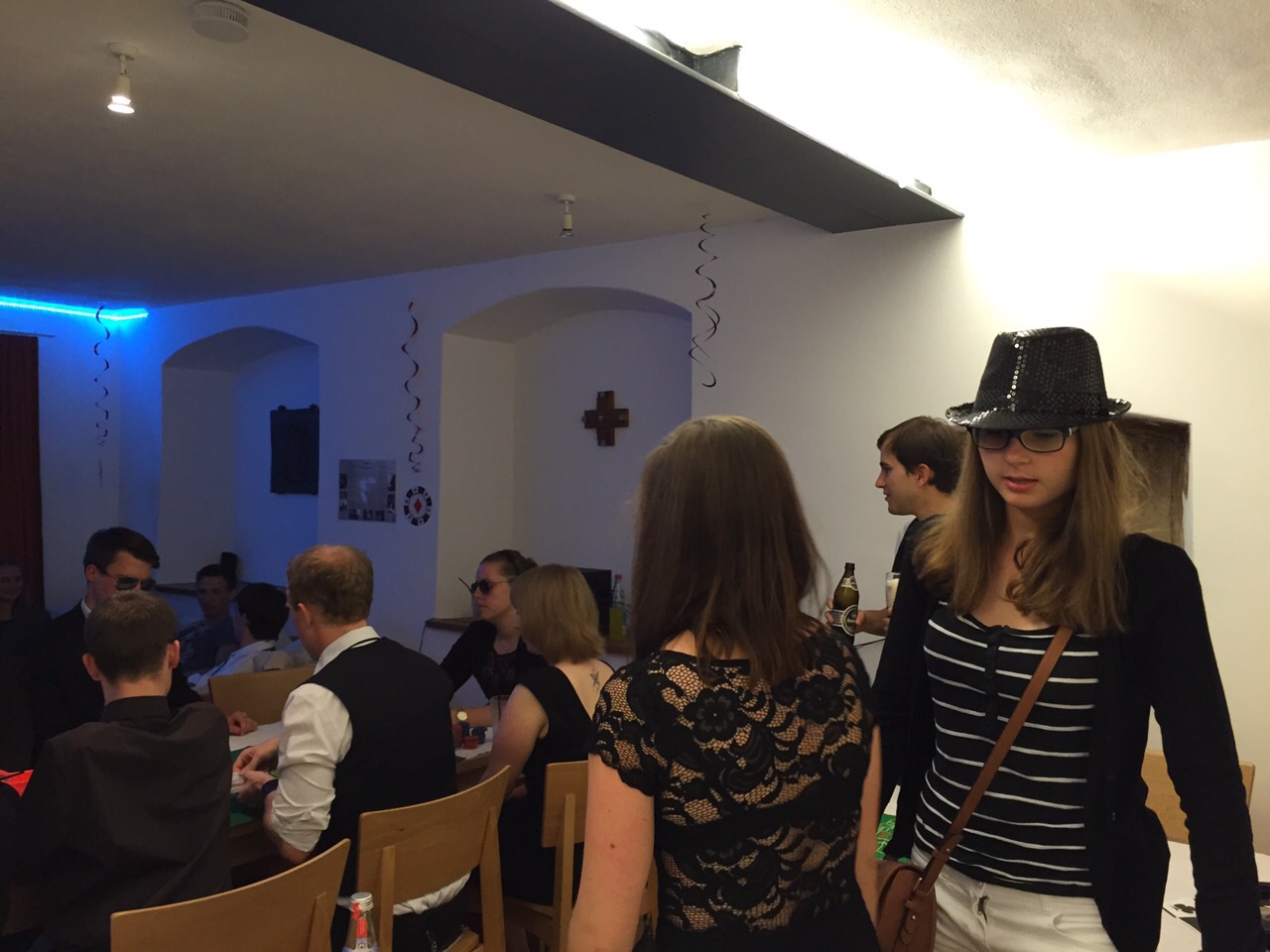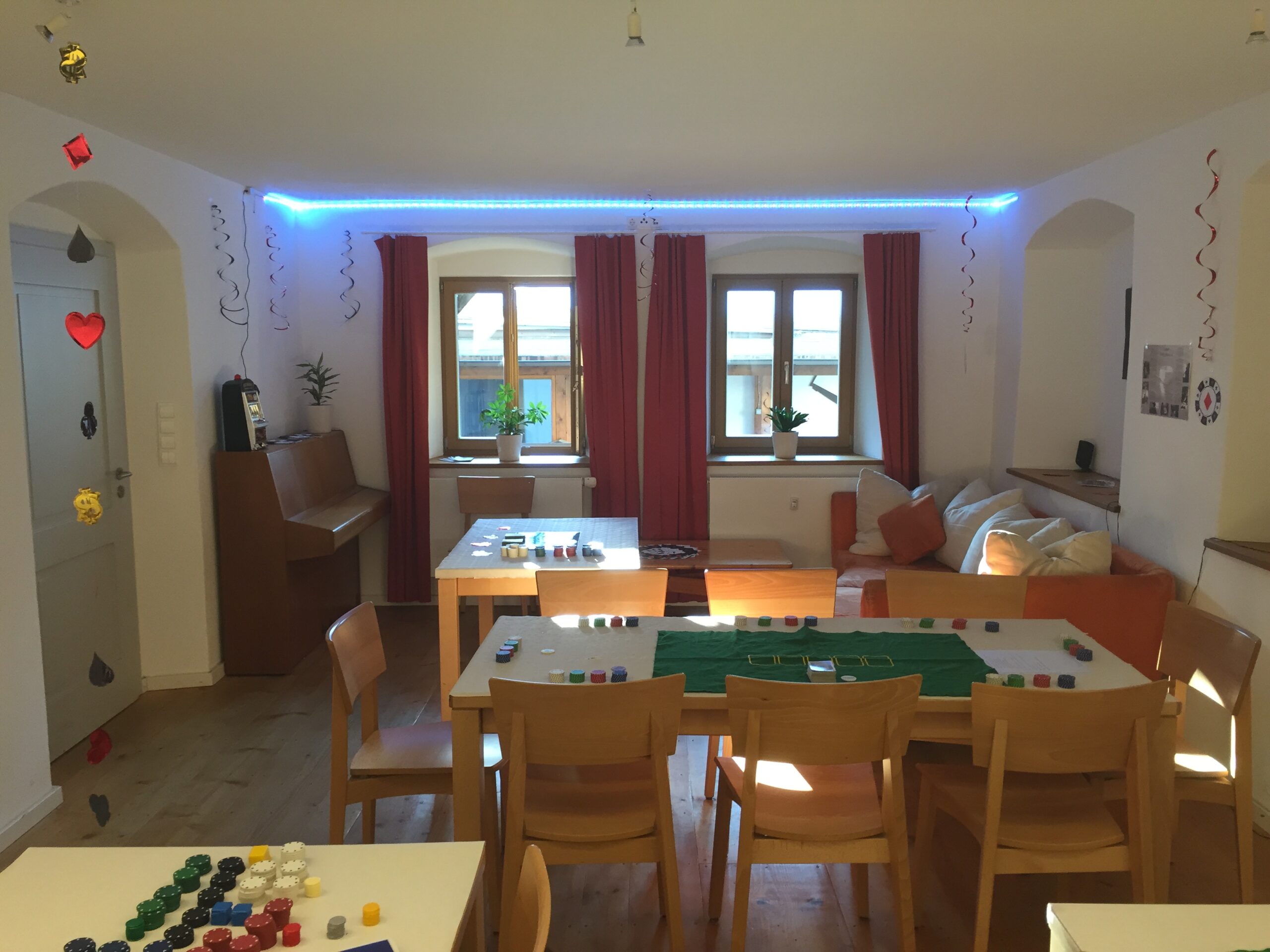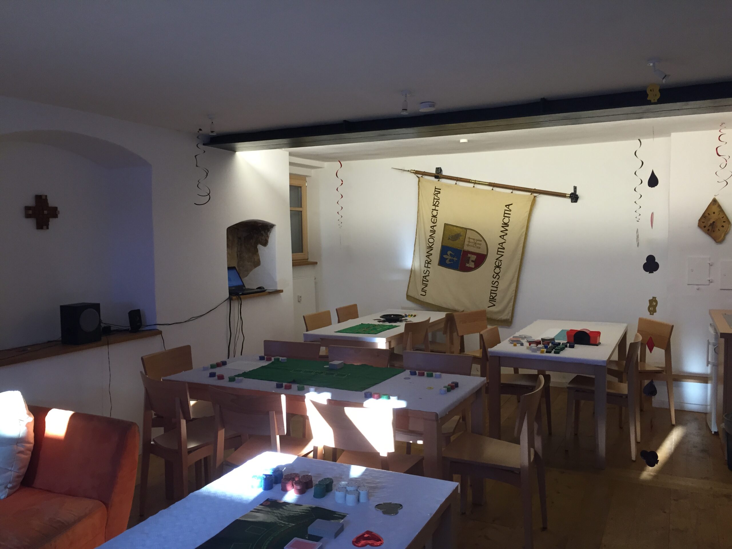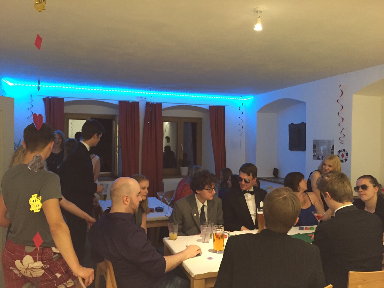 Unsere lb. Füxe begrüßten an der offenen Haustür mit ihrer charmanten Art die lieben Gäste und allen voran die superb und arkadisch anmutenden Damen sowie alle Farbenbrüder, die sich an diesem Abend auf dem dekorierten UV-Casino vorgefunden haben, mit einem frischen Sekt aus der Eisschale. Dem gesetzten Rahmen angepasst, waren alle adäquat gekleidet und für das große Spiel bereit. Darbietungen des Abends sind vor allen Dingen Poker, Black Jack, Roulette, ein Spielautomat und Bacarat gewesen. Den Außenbereich im Garten nutzen viele bis zur Nachtruhe, um die Wärme und die guten Gespräche zu genießen. Nebenbei durfte am aufwendig erstellten Buffettisch geschlemmt, sowie den köstlichen Getränken unserer Cocktail-Experten erlegen werden. Alles in allem gingen bei uns durchweg sehr positive Rückmeldungen ein, so dass uns ebenso sehr daran gelegen ist, im nächsten Sommer ähnliche Feierstunden anbieten zu können. Aber bis dahin darf sich jeder einen Eindruck von den unten zu sehenden Bildern verschaffen. Wir bedanken uns bei den erstaunlich vielen Gästen, bitten ums Weitersagen und um ein baldiges Wiedersehen bei uns im „Casino Frankonyal“!