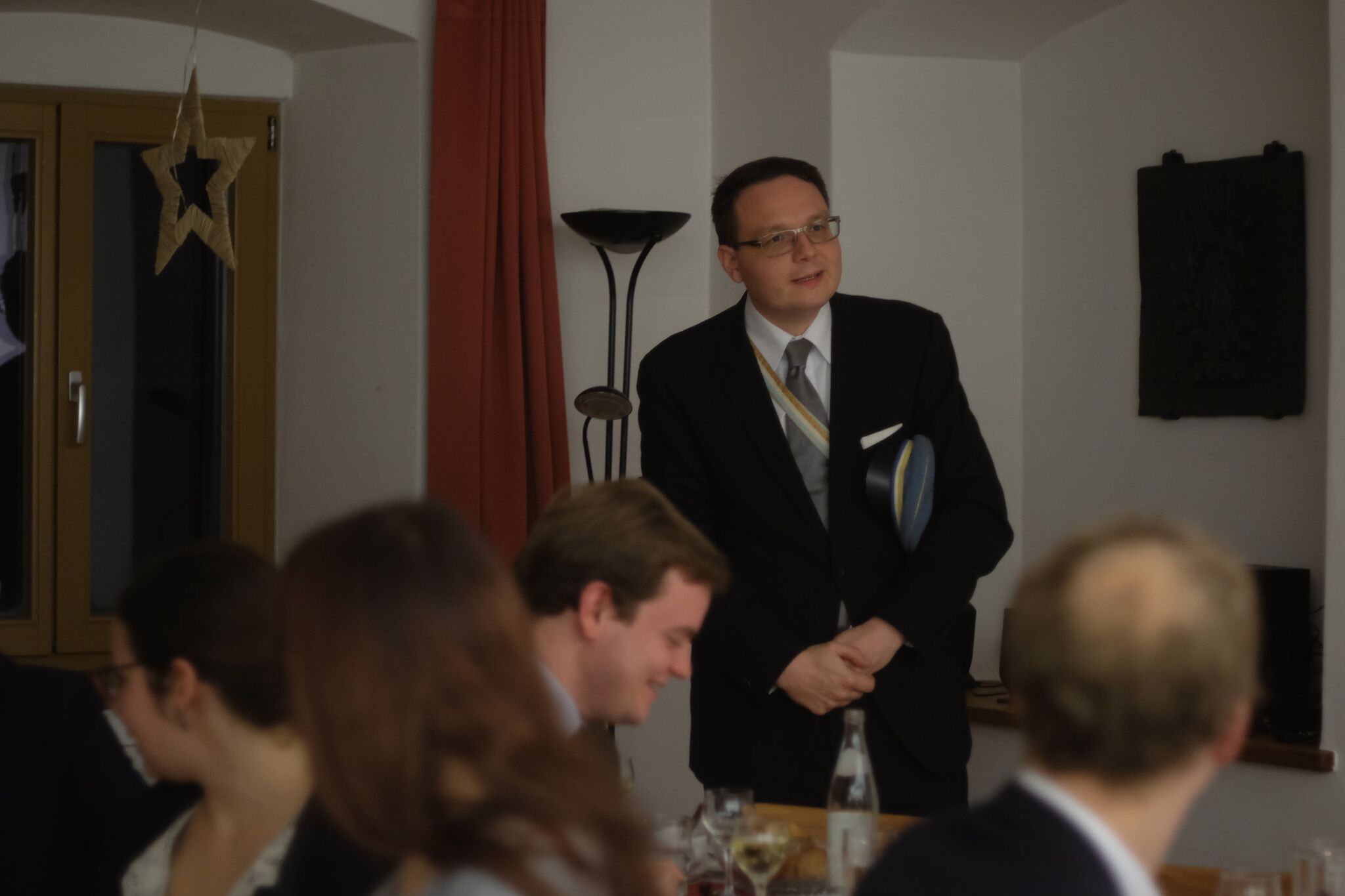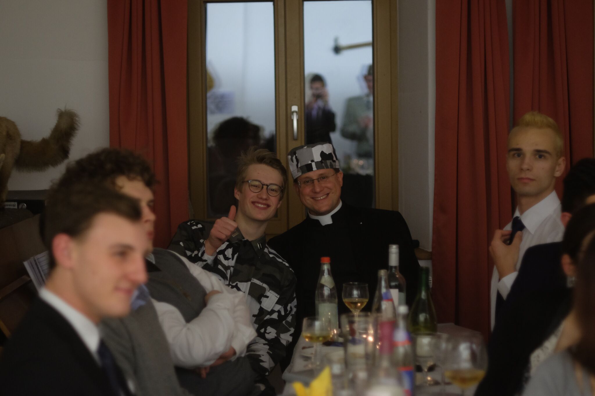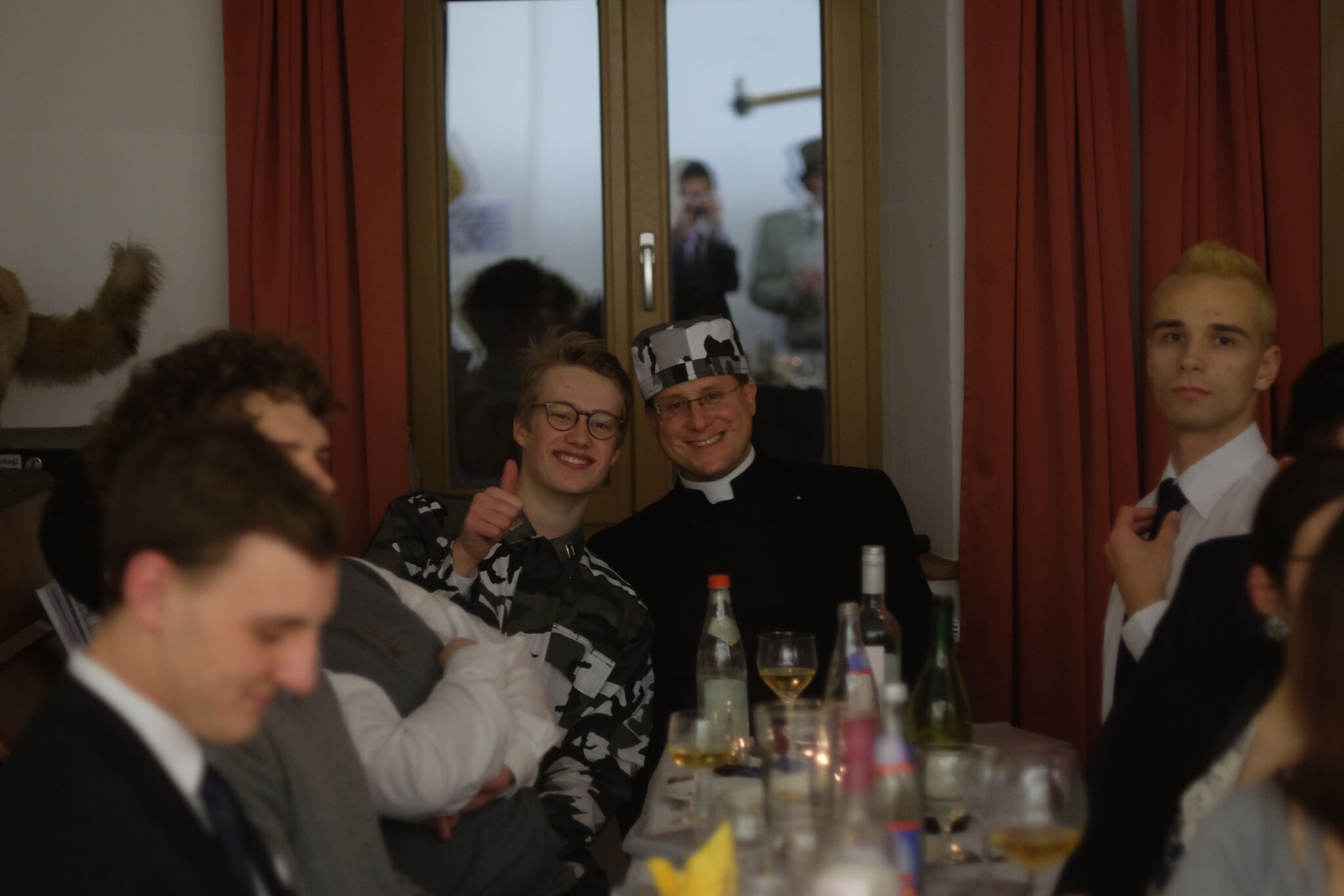 führte der hohe Senior auch an jenem Abend die Gäste in einem traditionell erheiternden feierlichen Programm durch den Abend. Es war uns eine große Freude, dass unser geistlicher Beirat und lieber Bundesbruder AH Domvikar Pfarrer Dr. Thomas Stübinger vulgo „Don Eleganza“ als Vertreter der hohen Geistlichkeit unserer altstudentischen und traditionellen Feier beiwohnte und uns als Weinorganist durch die musikalischen Gesänge geführt hat. Ebenso durften wir in unserer feierlichen Runde unseren lieben Farbenbruder und Vertreter einer e. s. v. K. D. St. V. Alcimonia zu Eichstätt im CV, Sebastian Kießig, den Vertreter unserer lieben Aktivitas sowie der Altherrenschaft in seiner Funktion als Ehrensenior (= Bindeglied), unseren lieben Bbr. Alexander Gabel vulgo „Schorle“ und schließlich stellv. für den Leitwolf unserer Altherrenschaft, Bbr. AH Josef Bauer v/o „Čebi“ sowie der Vorstandschaft unseres Hausbauvereins, den Gott des Weines höchstpersönlich, unseren lieben Bbr. AH Norbert Gabel v/o „Bacchus“, begrüßen.
