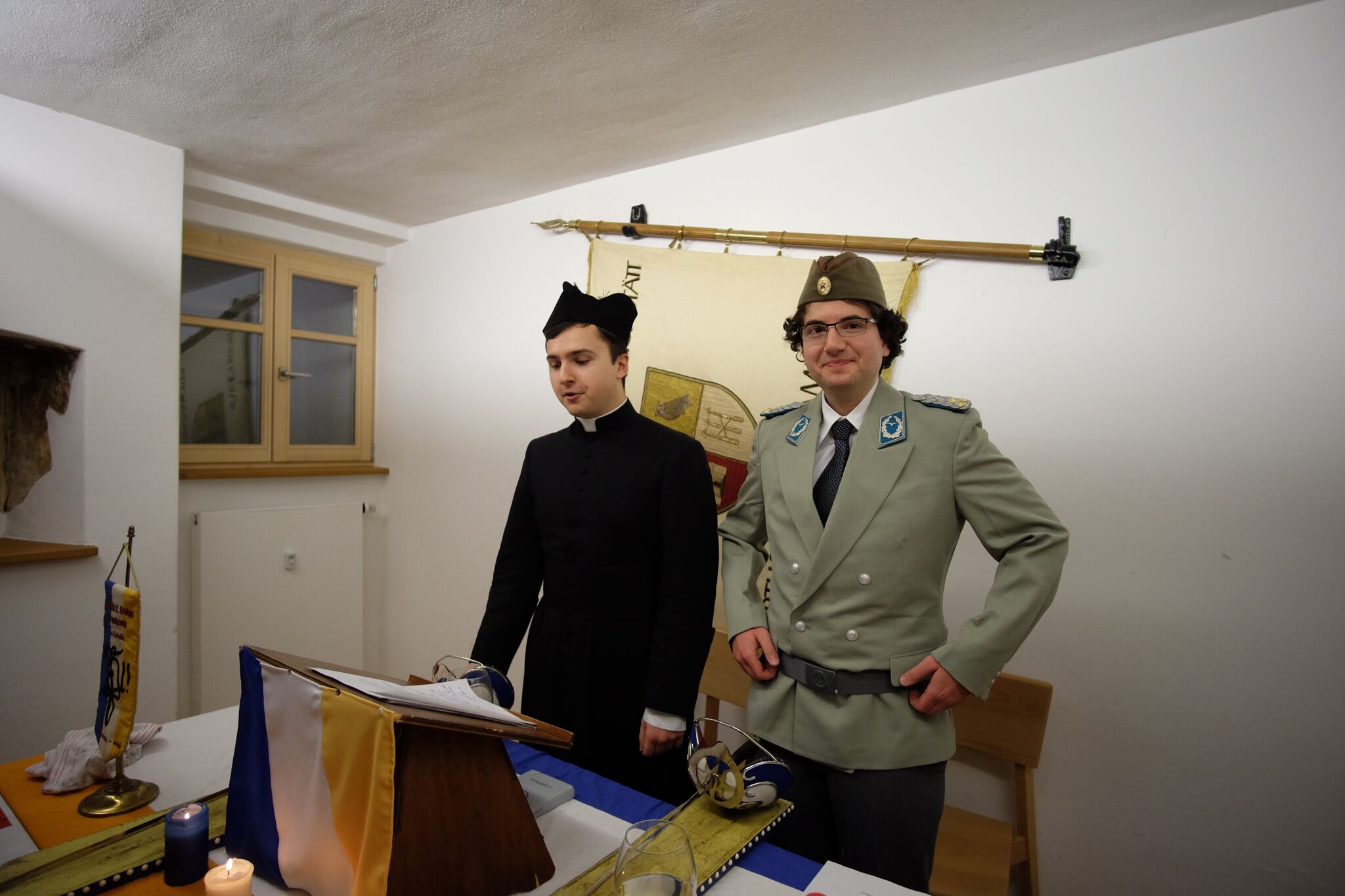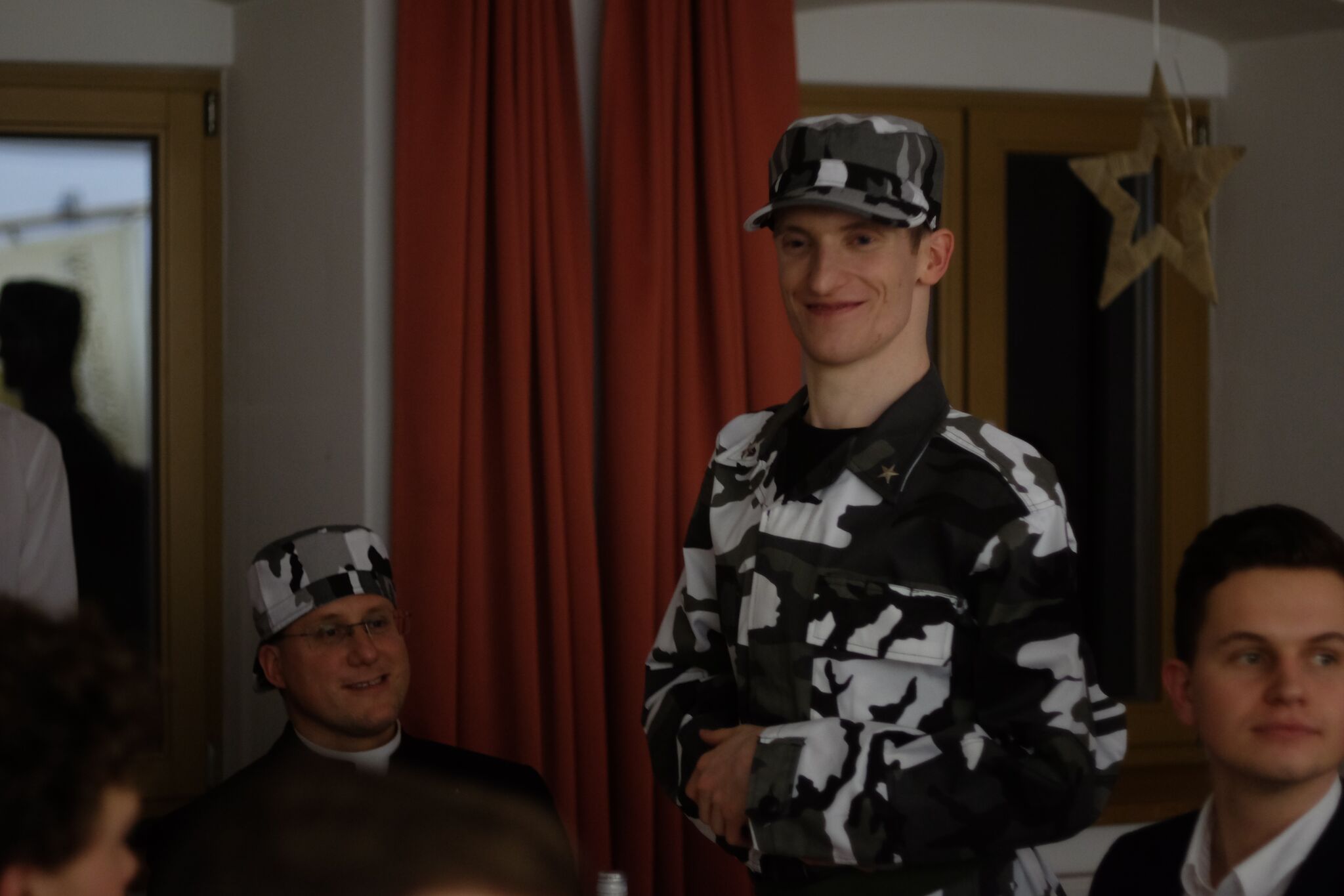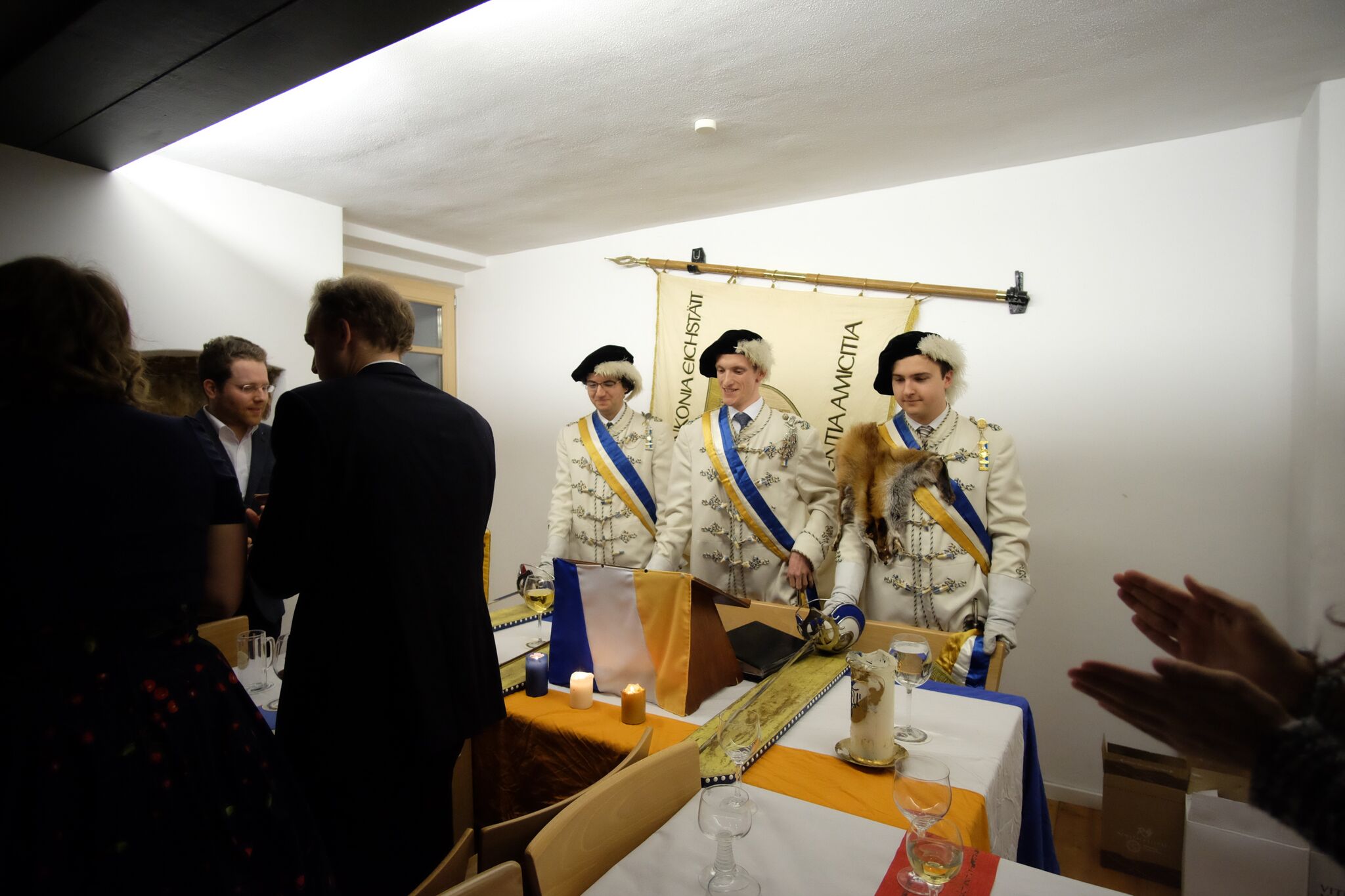 führte der hohe Senior auch an jenem Abend die Gäste in einem traditionell erheiternden feierlichen Programm durch den Abend. Es war uns eine große Freude, dass unser geistlicher Beirat und lieber Bundesbruder AH Domvikar Pfarrer Dr. Thomas Stübinger vulgo „Don Eleganza“ als Vertreter der hohen Geistlichkeit unserer altstudentischen und traditionellen Feier beiwohnte und uns als Weinorganist durch die musikalischen Gesänge geführt hat. Ebenso durften wir in unserer feierlichen Runde unseren lieben Farbenbruder und Vertreter einer e. s. v. K. D. St. V. Alcimonia zu Eichstätt im CV, Sebastian Kießig, den Vertreter unserer lieben Aktivitas sowie der Altherrenschaft in seiner Funktion als Ehrensenior (= Bindeglied), unseren lieben Bbr. Alexander Gabel vulgo „Schorle“ und schließlich stellv. für den Leitwolf unserer Altherrenschaft, Bbr. AH Josef Bauer v/o „Čebi“ sowie der Vorstandschaft unseres Hausbauvereins, den Gott des Weines höchstpersönlich, unseren lieben Bbr. AH Norbert Gabel v/o „Bacchus“, begrüßen.