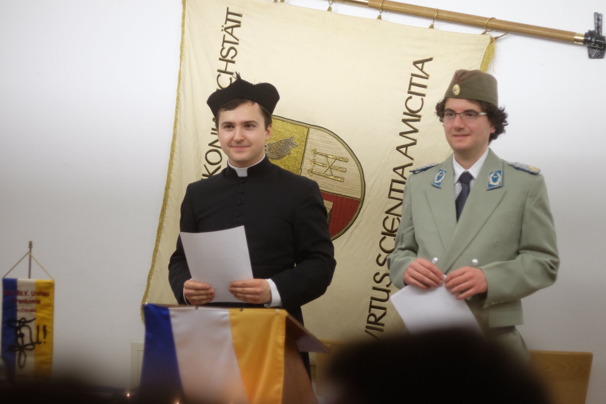 Von unseren drei Prinzipien VIRTUS, SCIENTIA, AMICITIA widmete der hohe Senior seine besondere Aufmerksamkeit der SCIENTIA in seiner Prinzipienrede. Jene nimmt den Unitarier besonders in die Pflicht, denn sie verlangt von ihm nicht nur sein Studium zielstrebig zu verfolgen, sondern auch über ein fundiertes Wissen zu verfügen, um sich selbst eine Meinung bilden, mitreden und als Unitarier in Kirche und Staat seinen Mann stehen zu können, wie man es bei seinem Burscheneid, seiner Treuebekundung, gelobt hat. Und jener Zweck heiligt die Mittel, die sich unsere Gründerväter hierzu angedacht haben: die im unitarischen Grundgesetz verankerten Wissenschaftlichen Sitzungen. Darin lässt sich ermessen, welch höchstgradigen Stellenwert die wissenschaftlichen Sitzungen und damit auch die persönliche Weiterbildung der Unitarier für die Gestalter des UNITAS-Verbandes hatten. Die Aktiven sollen hier in freundschaftlicher Atmosphäre und ohne Druck, notwendige Fähigkeiten erwerben, die sie sowohl im Studium als auch später im Berufsleben brauchen: Die Fähigkeit, sich in fachfremde Themengebiete einzuarbeiten, und diese dann auch gegenüber dem Adressaten, beispielsweise einem UNITAS-Verein klar und anschaulich darstellen zu können. Gerade auch in solchen Belangen sind wir Couleurstudenten dazu angehalten, um für Nachwuchs zu sorgen, um die Messlatte unseres wissenschaftlichen Niveaus auch weiterhin hochzuhalten. Als herausragendes Beispiel gilt freilich Prof. Dr. Franz Hitze, der seine Gedanken über eine katholische Soziallehre – als weitreichendes und erstaunliches Resultat – inmitten eines solchen Vortrags formuliert hat und erst später auf Drängen seiner Bundesbrüder hin entfaltete. Jenes herausragende Fallbeispiel ist geradezu vortrefflich für ein Konglomerat unserer unitarischen Prinzipien – VIRTUS, SCIENTIA und AMICITIA! Uns allen sollte es ein Anliegen sein, uns wieder darauf zu besinnen, was die eigentliche UNITARISCHE IDEE bedeutet und dies in den kommenden Semestern auch wieder versuchen, so umzusetzen – dies ist unsere Aufgabe, unsere Leidenschaft und Passion.